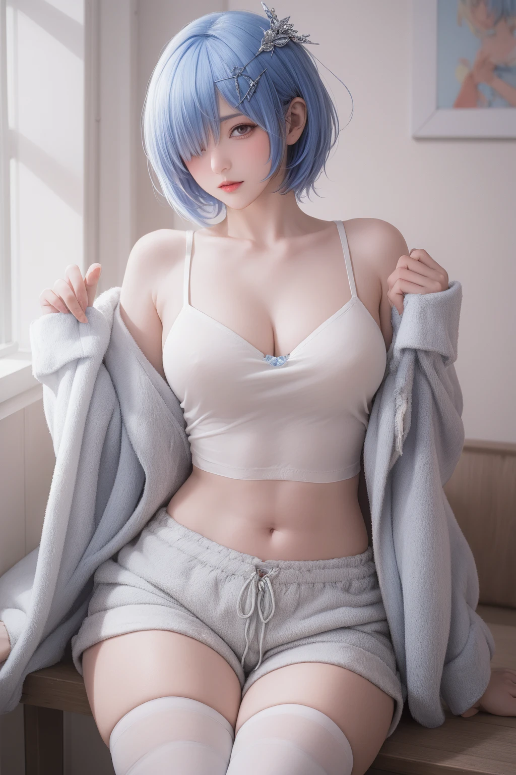 权重推荐0.8-0.9,提示词:future0604,solo,white thighhighs,blue haired girl \(kamisimo 90\),x hair ornament,bare shoulders,jacket,(Hair over one eye:1.2),navel,white shorts,white camisole,Open clothes