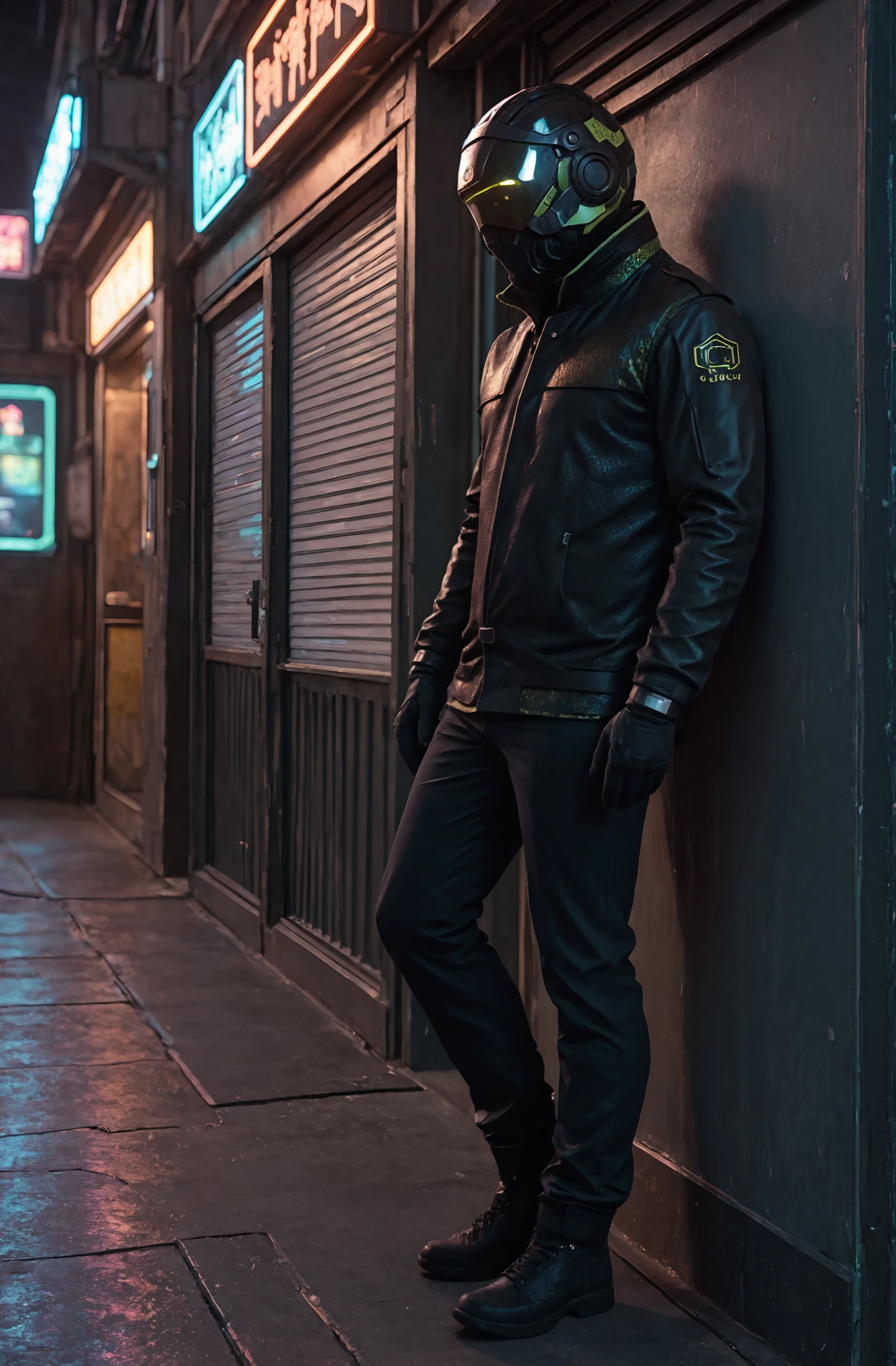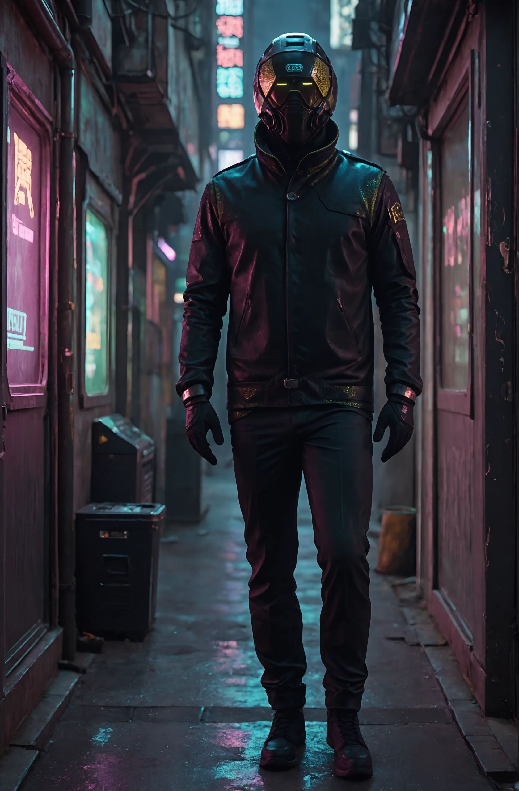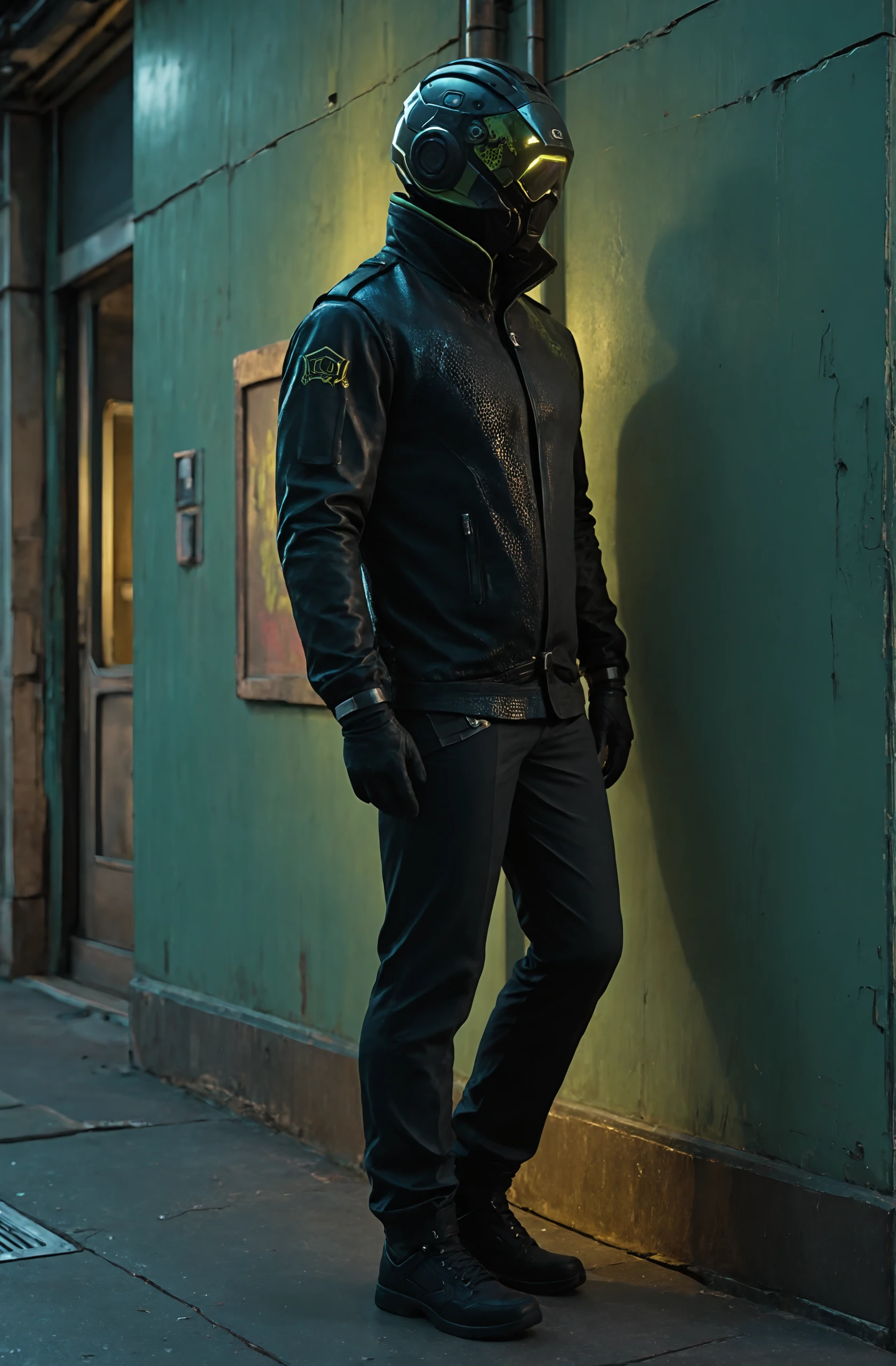 helmet, mask, glowing, long sleeves, black leather jacket, black gloves,