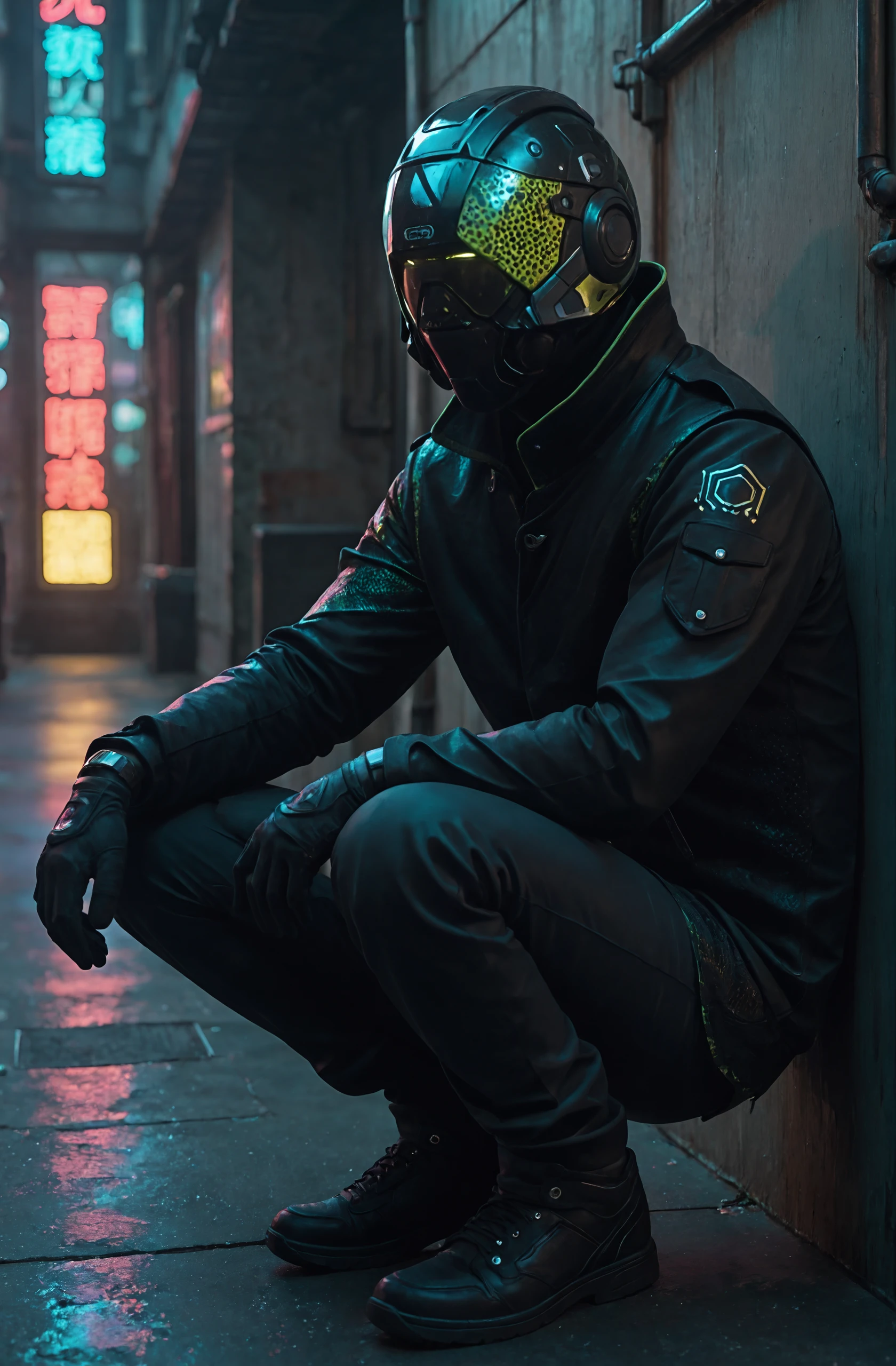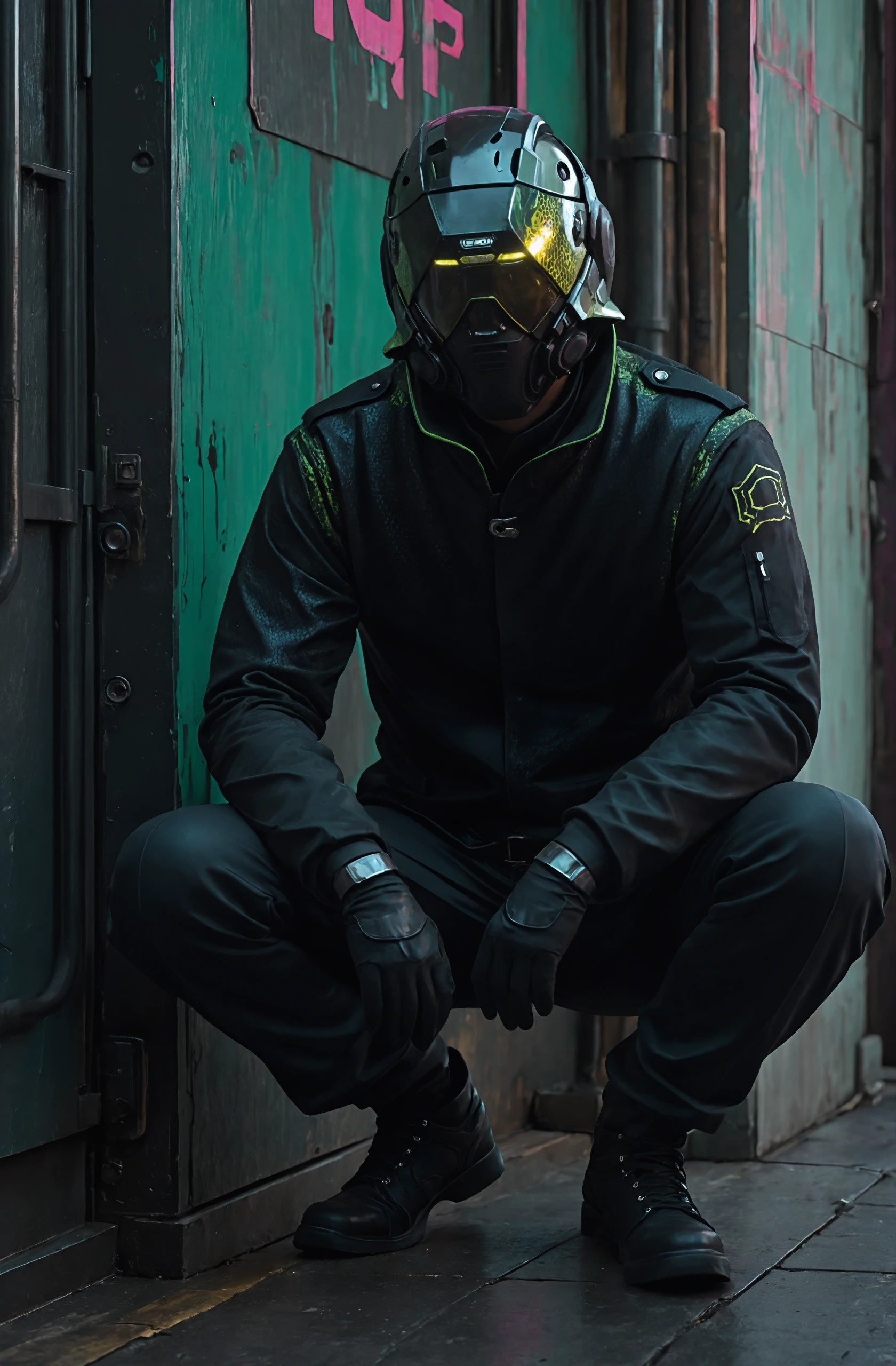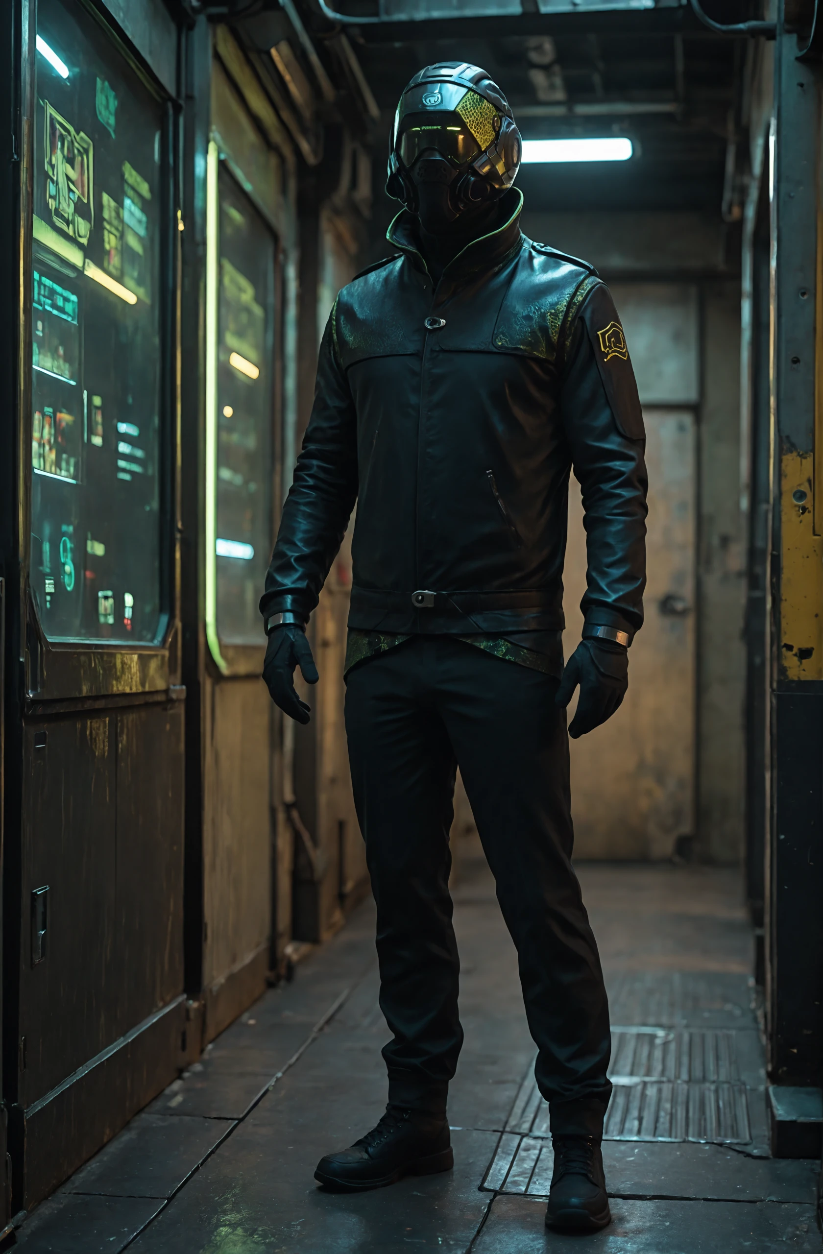 helmet, mask, glowing, long sleeves, black leather jacket, black gloves,