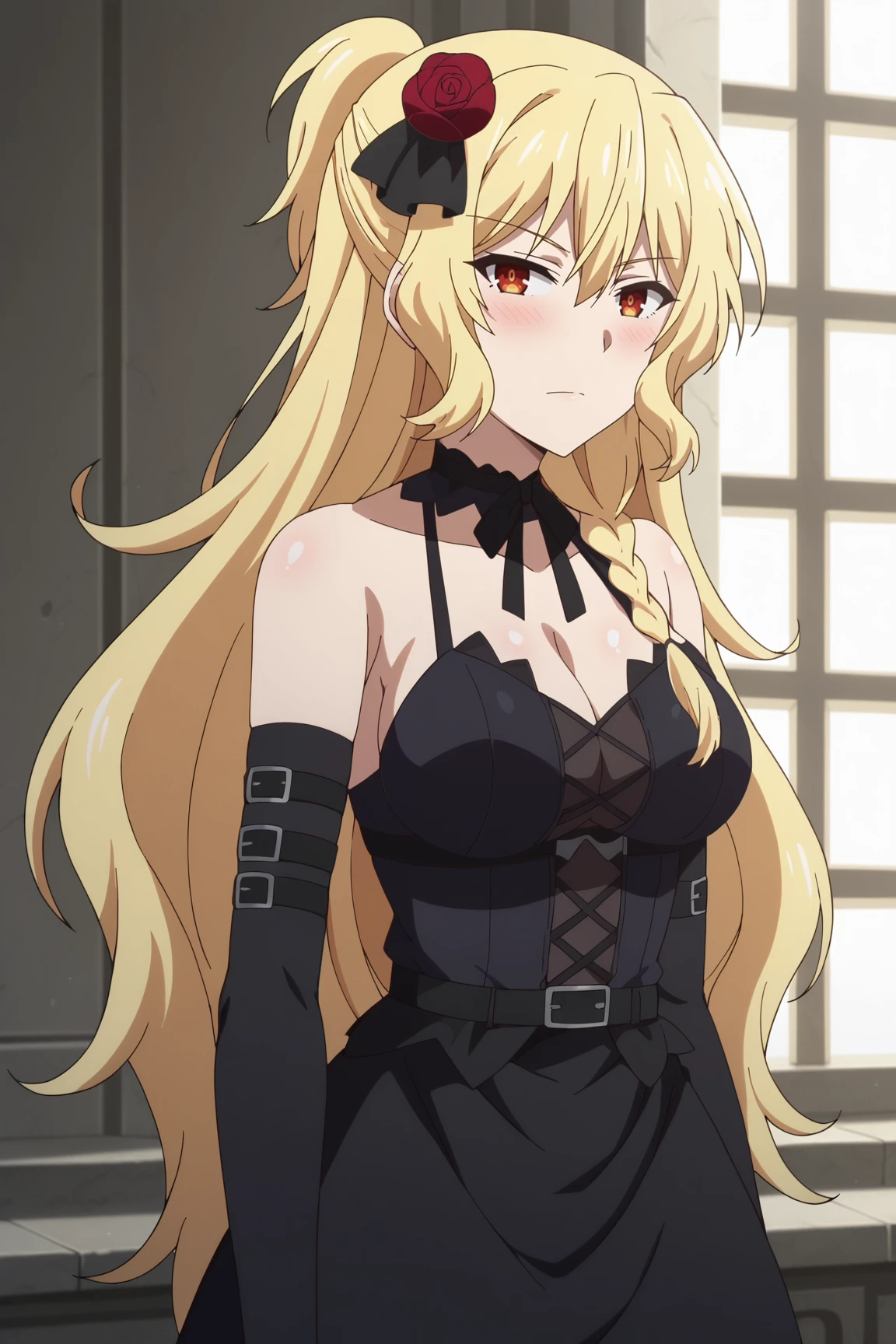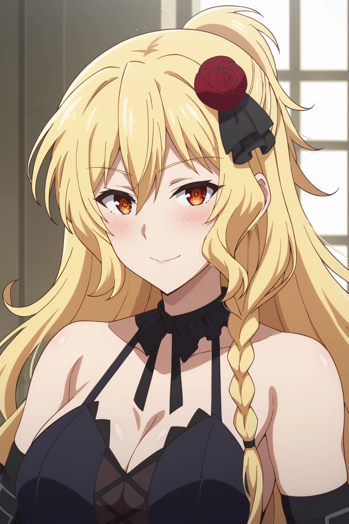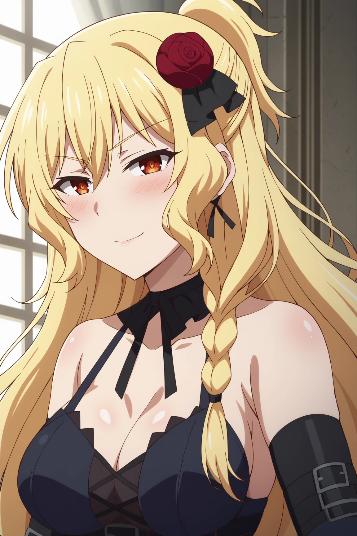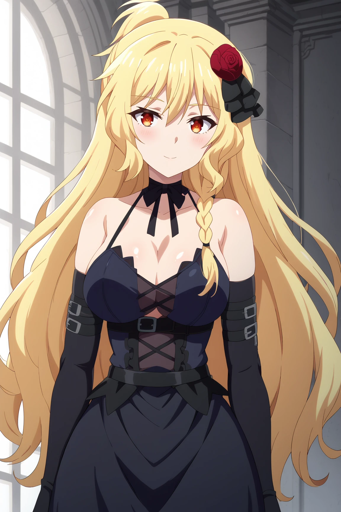1girl, celica arfonia, rokudenashi majutsu koushi to akashic record, red eyes, blonde hair, long hair, side braid, hair flower, hair ornament, rose, large breasts,outfit 1 (black dress):
