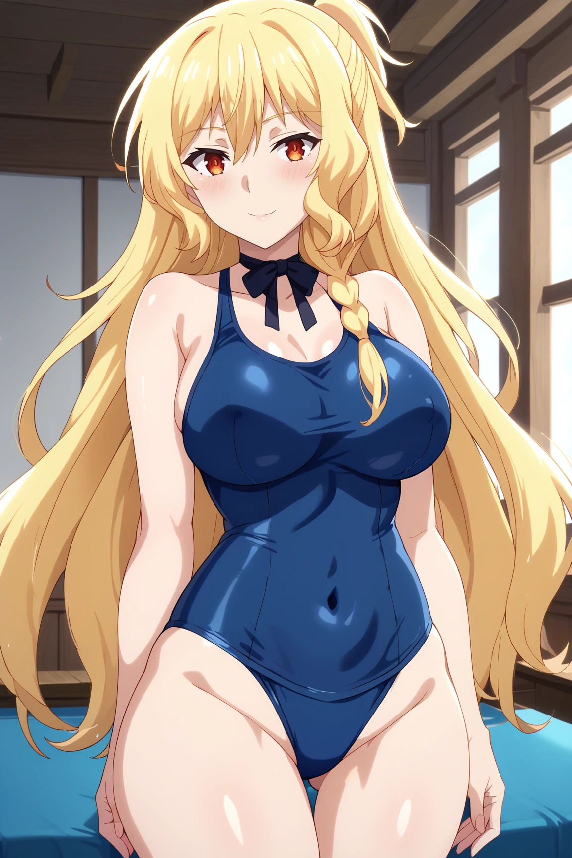 1girl, celica arfonia, rokudenashi majutsu koushi to akashic record, red eyes, blonde hair, long hair, side braid, hair flower, hair ornament, rose, large breasts,