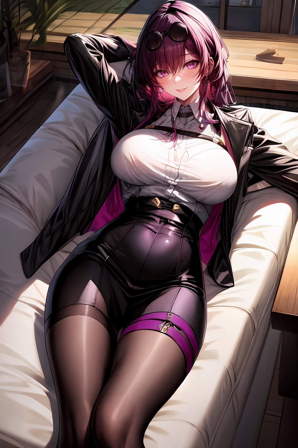 tayakfk,1girl, purple hair, long hair, bangs, large breasts,red eyes, eyewear on head,jacket, collared shirt,white shirt,long sleeves, black skirt, gloves,brown pantyhose, thigh strap,