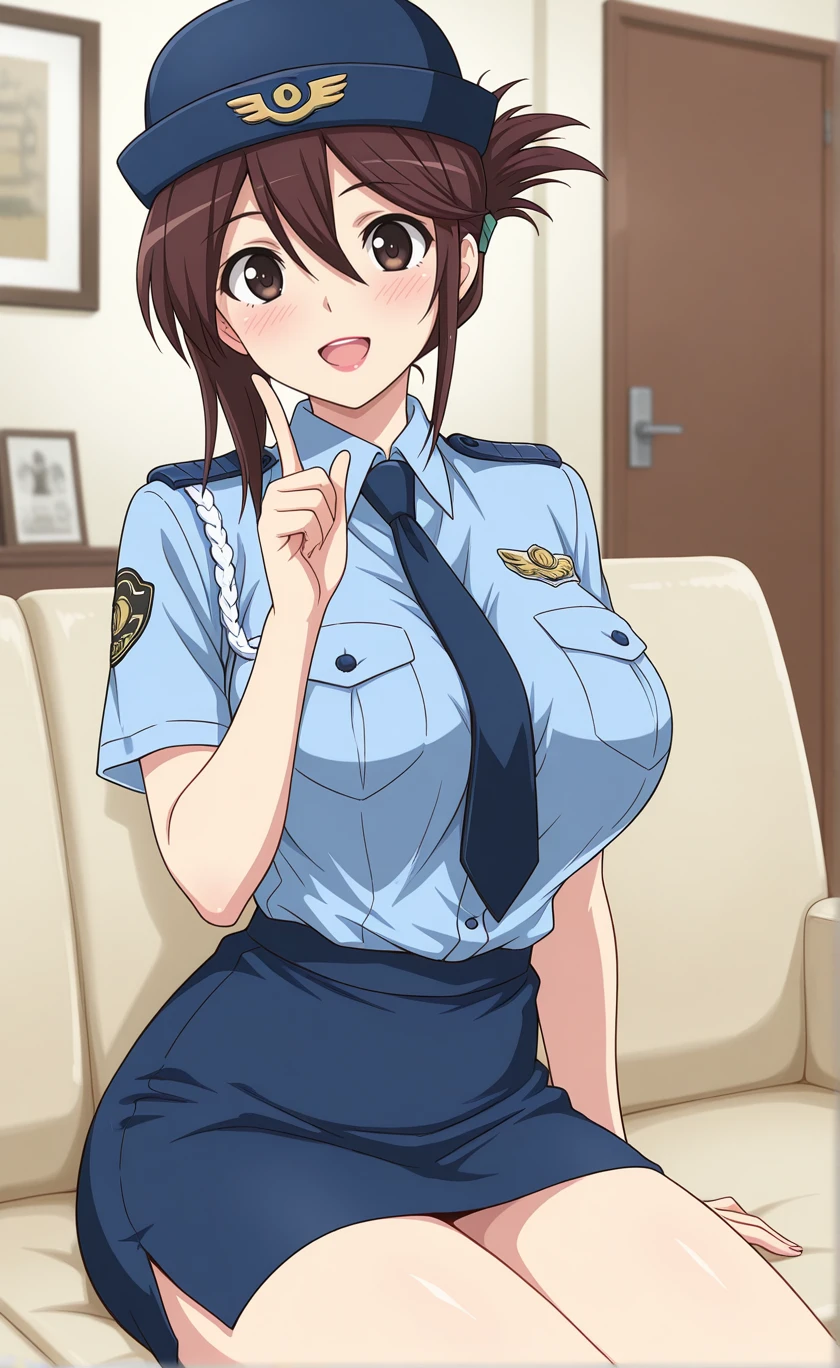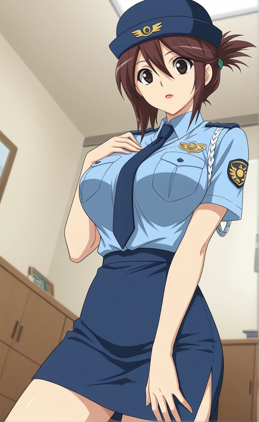 best quality,masterpiece,seikonqplicw0mn,anime coloring,solo,policewoman, police, brown hair, short hair,between eyes, folded ponytail,, brown eyes, large breasts, {legs |}, police uniform, uniform, female service cap, hat, necktie, pencil skirt, miniskirt, skirt, side slit,(lipstick:0.8),outdoors,city,smile,looking at viewer,sensitive, <lora:SeikonnoQwaserPoliceW0man2:1>