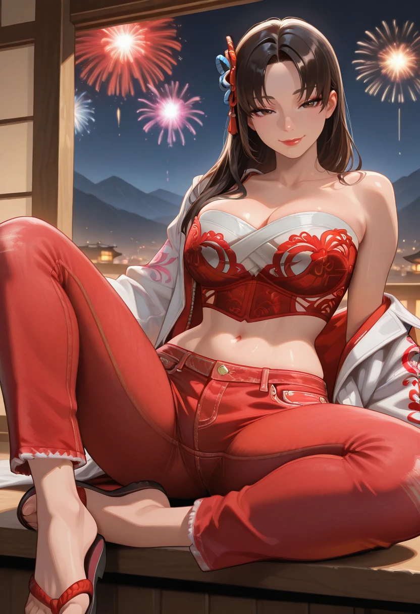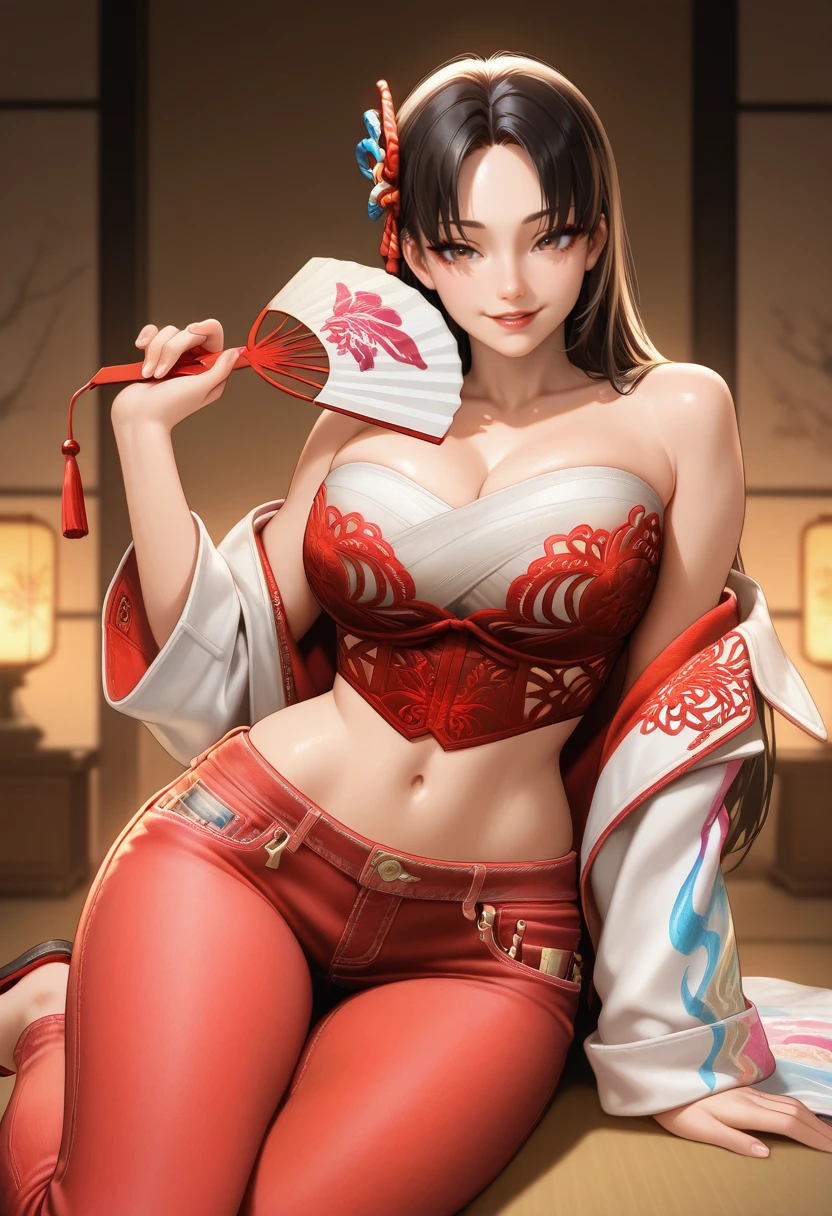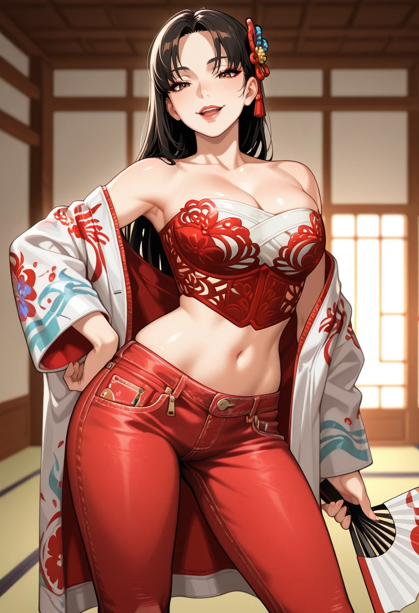 "COS3MAI, black hair, parted bangs, long hair, hair down, hair ornament,brown eyes, lips, red crop top, embriodery, bandaged chest, red jeans, multi-colored coat, off shoulder,"