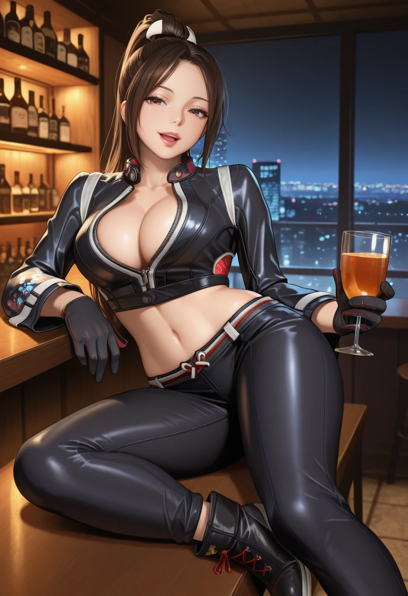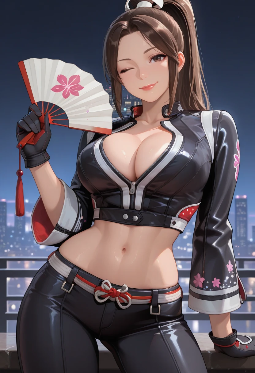 "SMACOTW, brown hair, long hair, high ponytail, brown eyes, lips, cropped jacket, long sleeves, unzipped, black gloves, midriff, black pants"