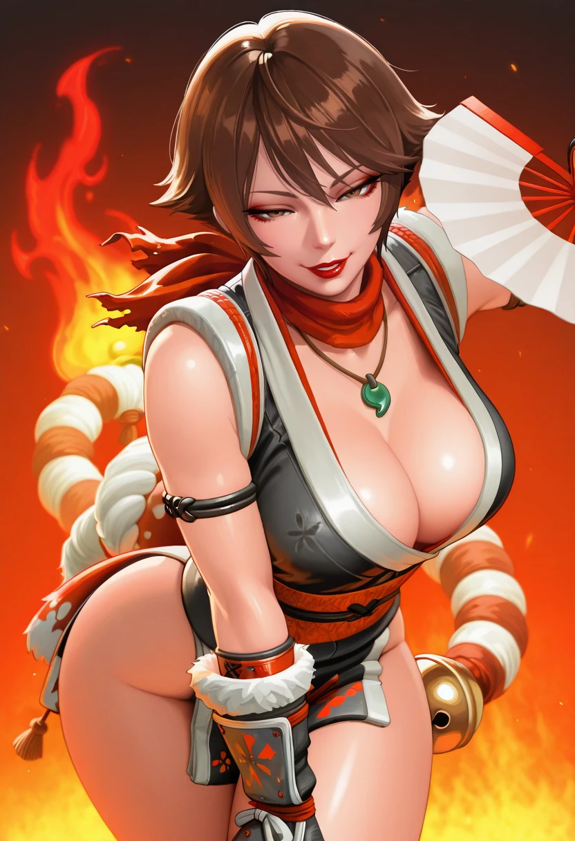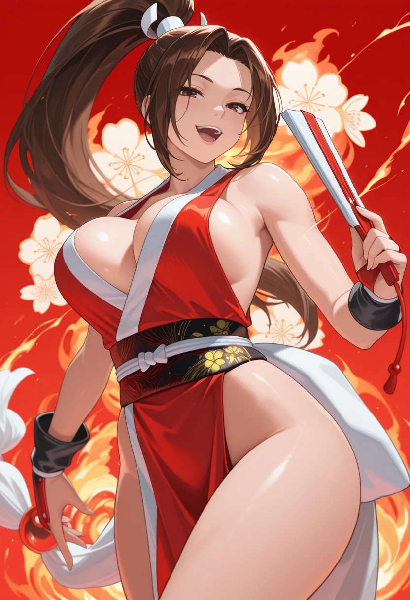 "SHMAFF, brown hair, long hair,parted hair, brown eyes, lips, high ponytail, red sleeveless kimono, pelvic curtain, revealing clothes, obi, wrist guards"