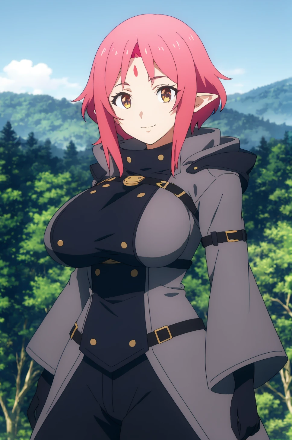 gloves,black gloves, long sleeves, coat, buttons, forehead jewel, wide sleeves, hood, cloak