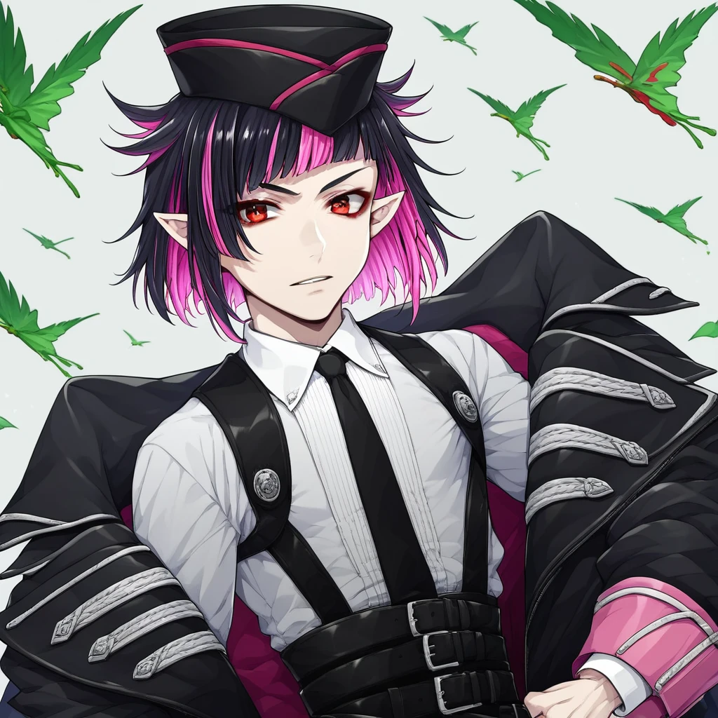 black hair, pointy ears, shirt, hat, pink hair, necktie, solo, 1boy, multicolored hair, red eyes