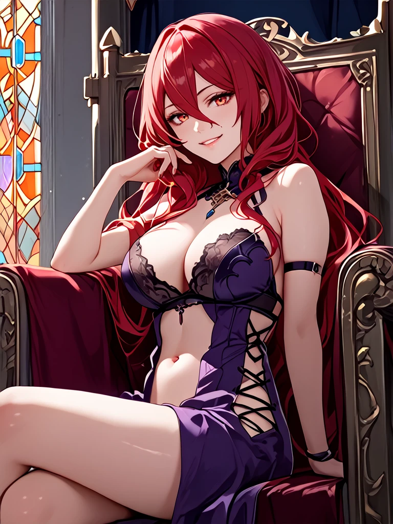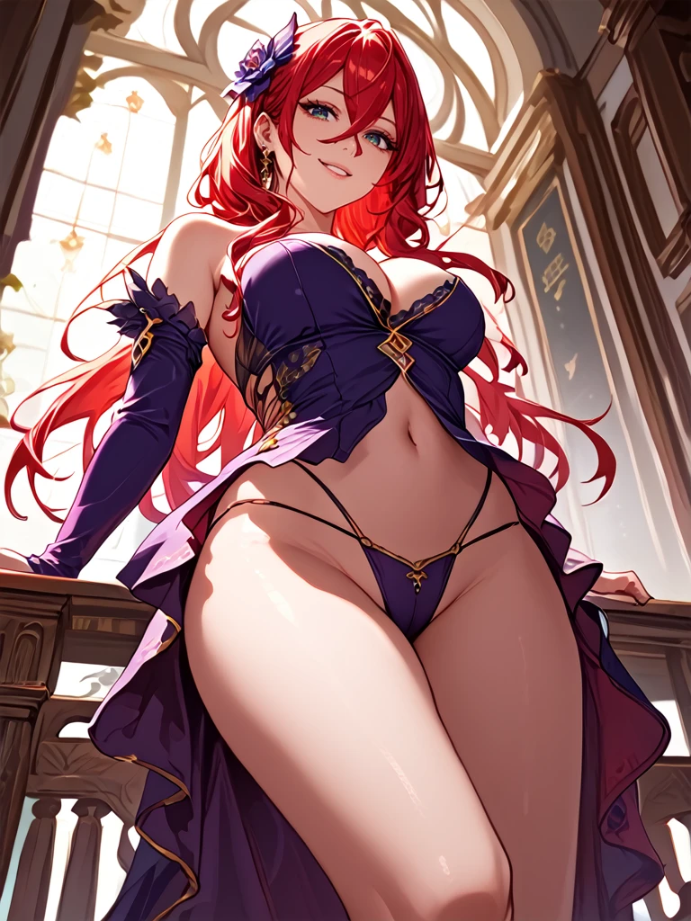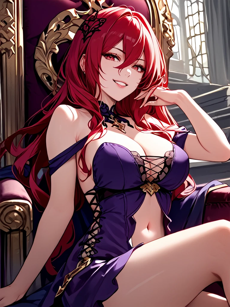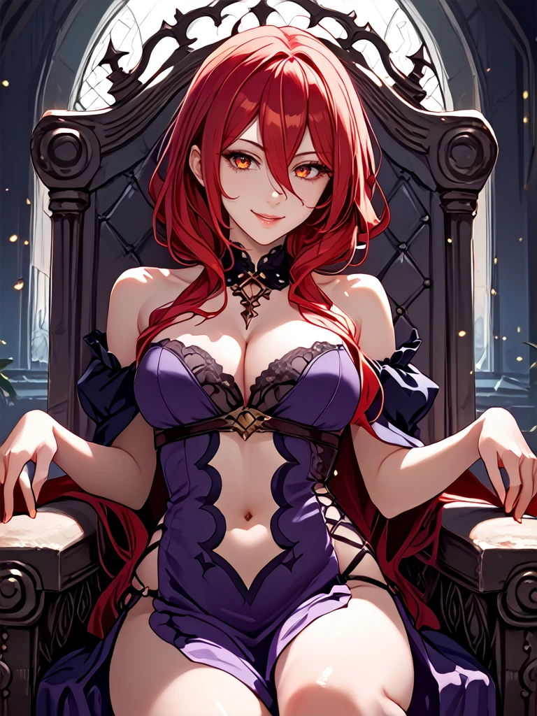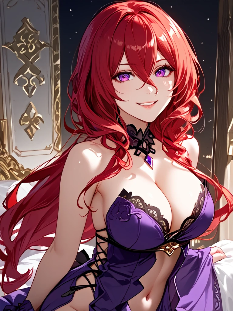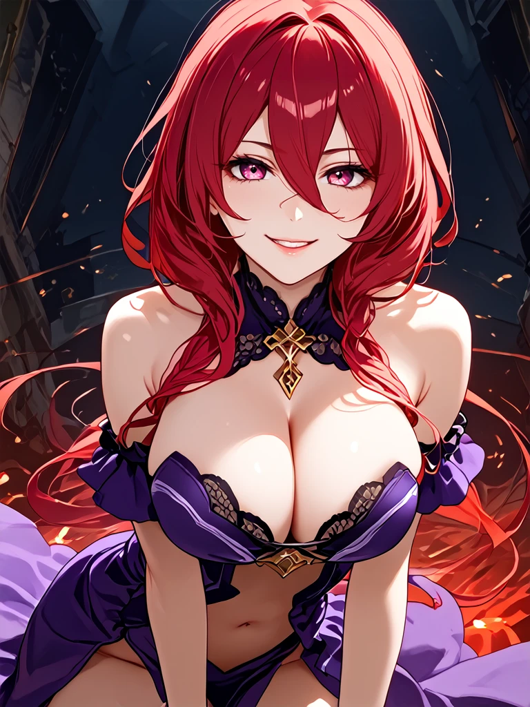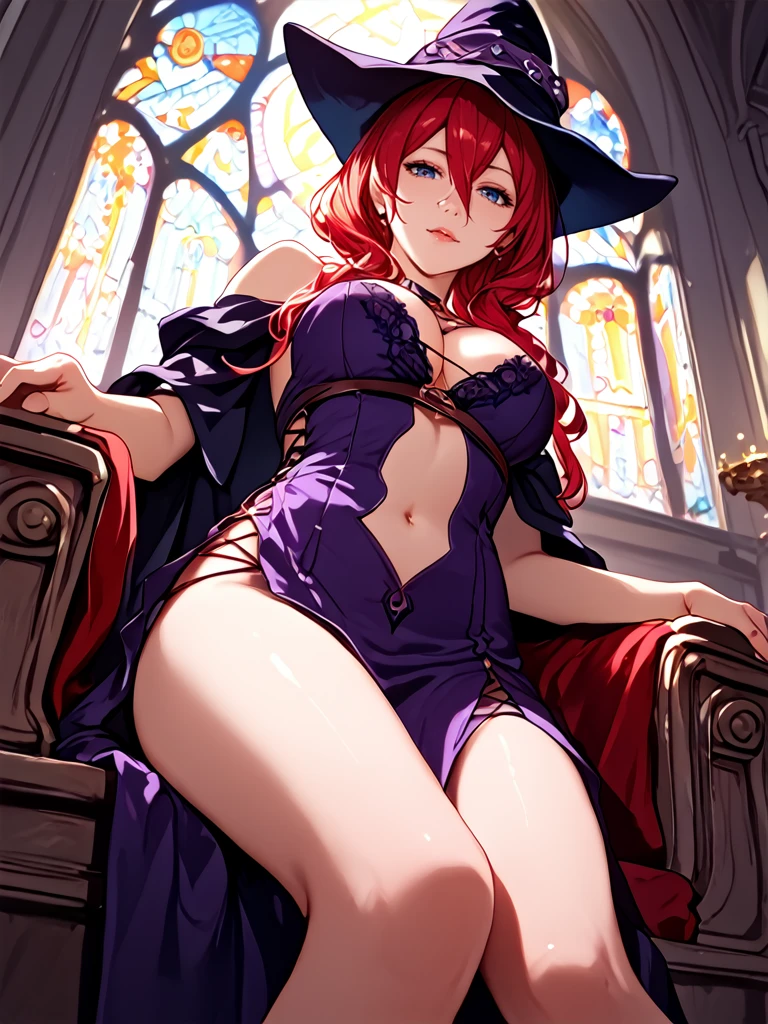 long hair,red hair,hair between eyes,medium chest,cleavage,bare shoulders,purple dress,witch,witch hat,navel,