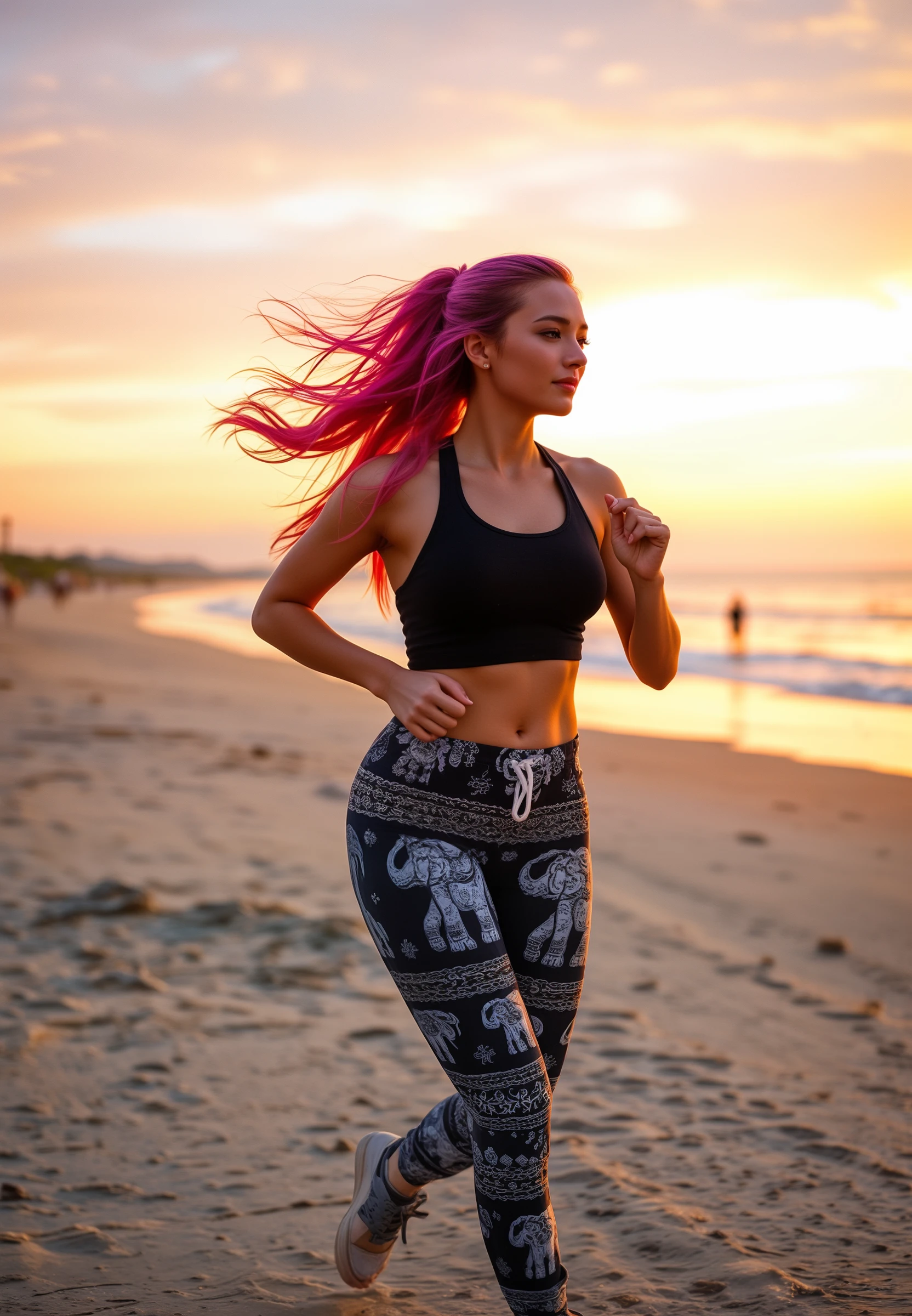 Try out : changpant, elephant-patterned pants, a 25-year-old woman with long pink hair in a sheer crop top, leaning against a balcony railing with a city skyline behind her, the wind teasing her hair.