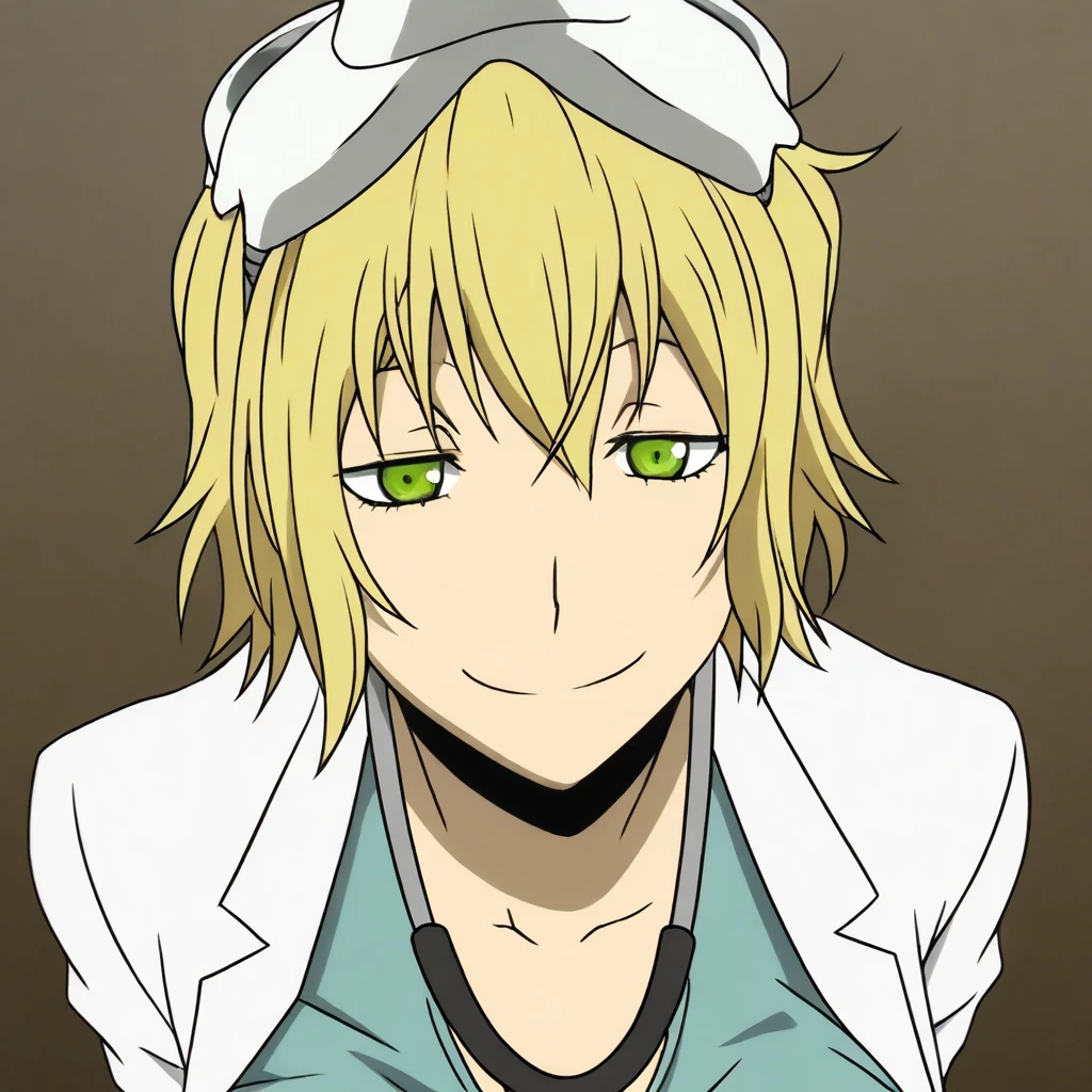 short hair, blonde hair, lime green eyes, well-endowed, large breasts, white lab coat, turquoise shirt, gray pants, white sneakers, gas mask on head, stethoscope underneath clothes, lidded eyes,