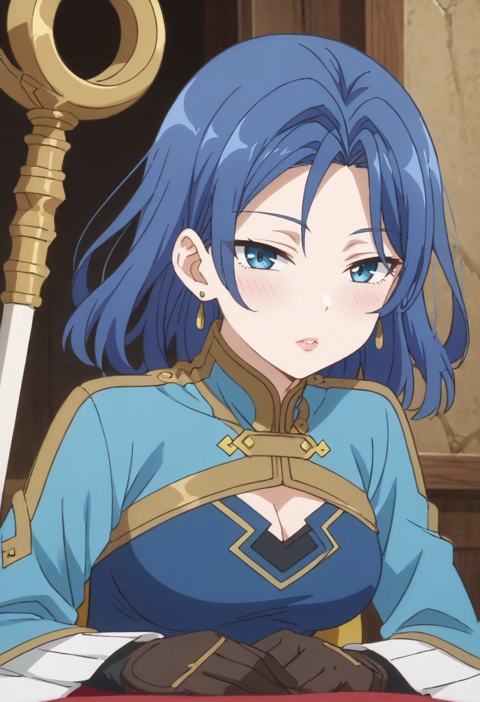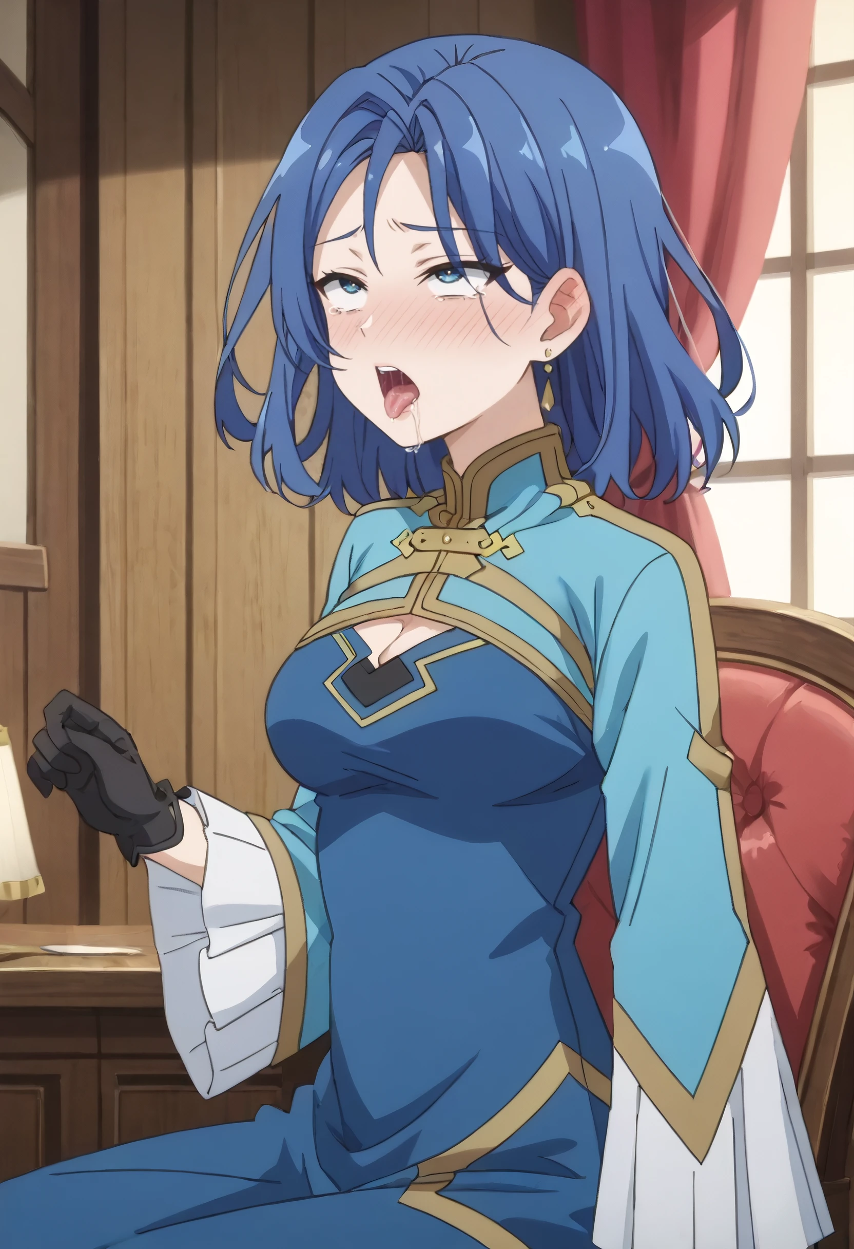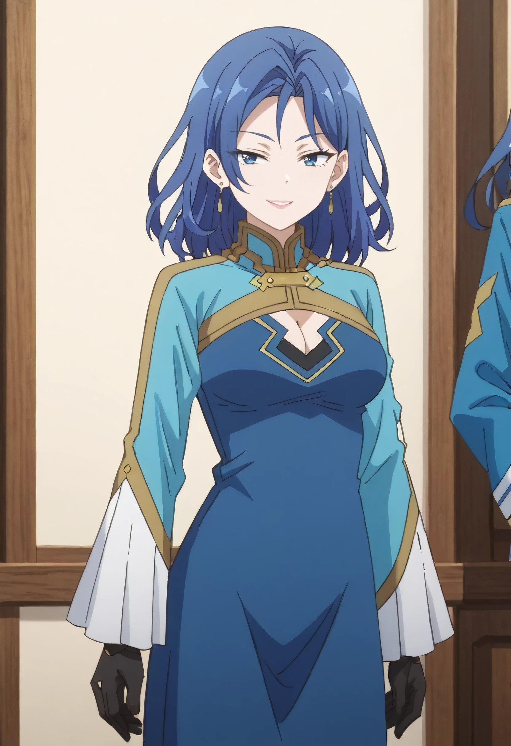 FilminaOutfit, earrings, jewelry, blue dress, dress, long sleeves, gloves, clothing cutout, cleavage cutout, shrug (clothing), capelet, black gloves, wide sleeves, long dress,