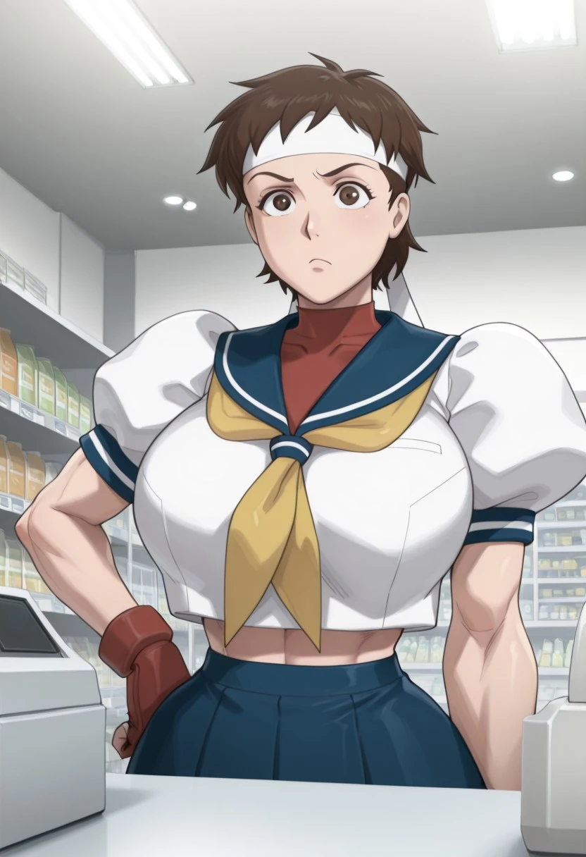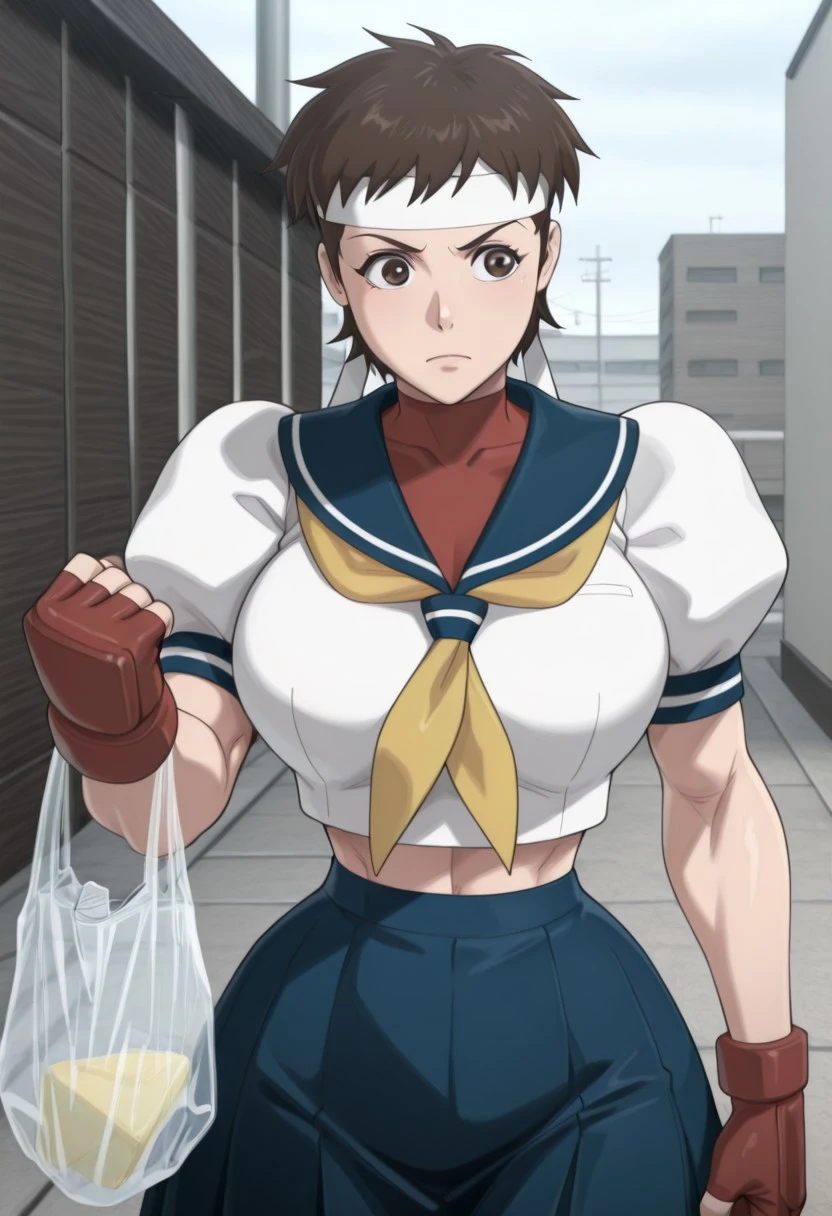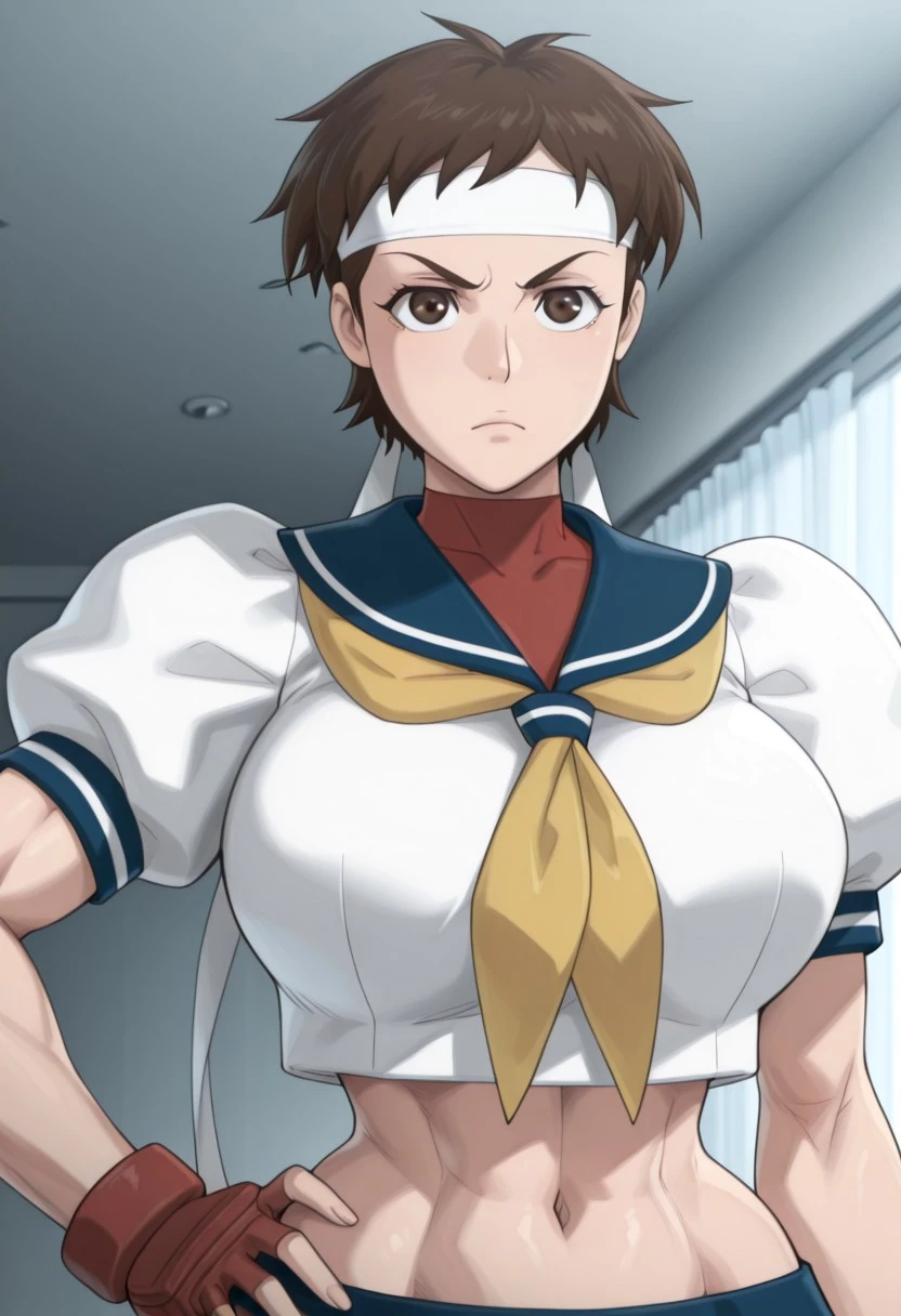 white headband, long headband, red gloves, fingerless gloves, blue skirt, midriff, blue sailor collar, school uniform, short sleeves, puffy sleeves, cropped serafuku, white serafuku, red turtleneck, yellow neckerchief,
