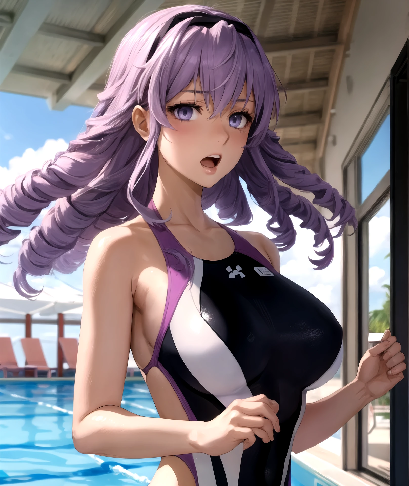 Promts: junko hokaze, purple eyes, purple hair, long hair, drill hair,