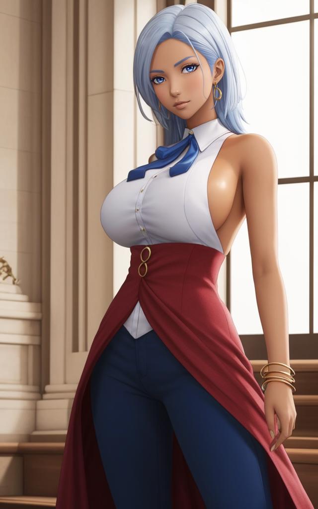 a woman, tall, dark tanned skin, sideboob, dark silver hair, deep blue eyes, white dress with open back and bibs, blue ribbon, red long skirt, blue dress pants, light blue shoes, a pair of gold bracelets on her left arm and a blue and white bracelet on her right wrist