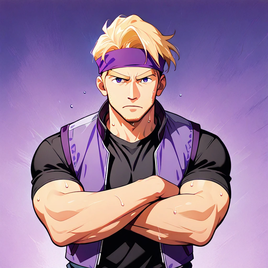 rider, 1man, male, mature male, solo, bulky build, blonde hair, blonde eyebrows, purple headband, dark blue eyes, purple biker vest, black t-shirt, dark blue sweat pants, brown boots