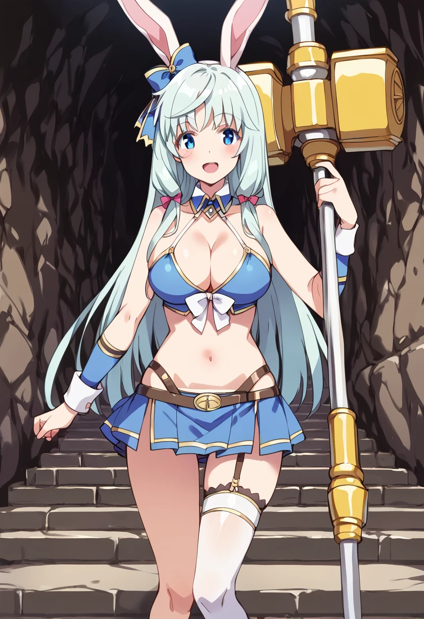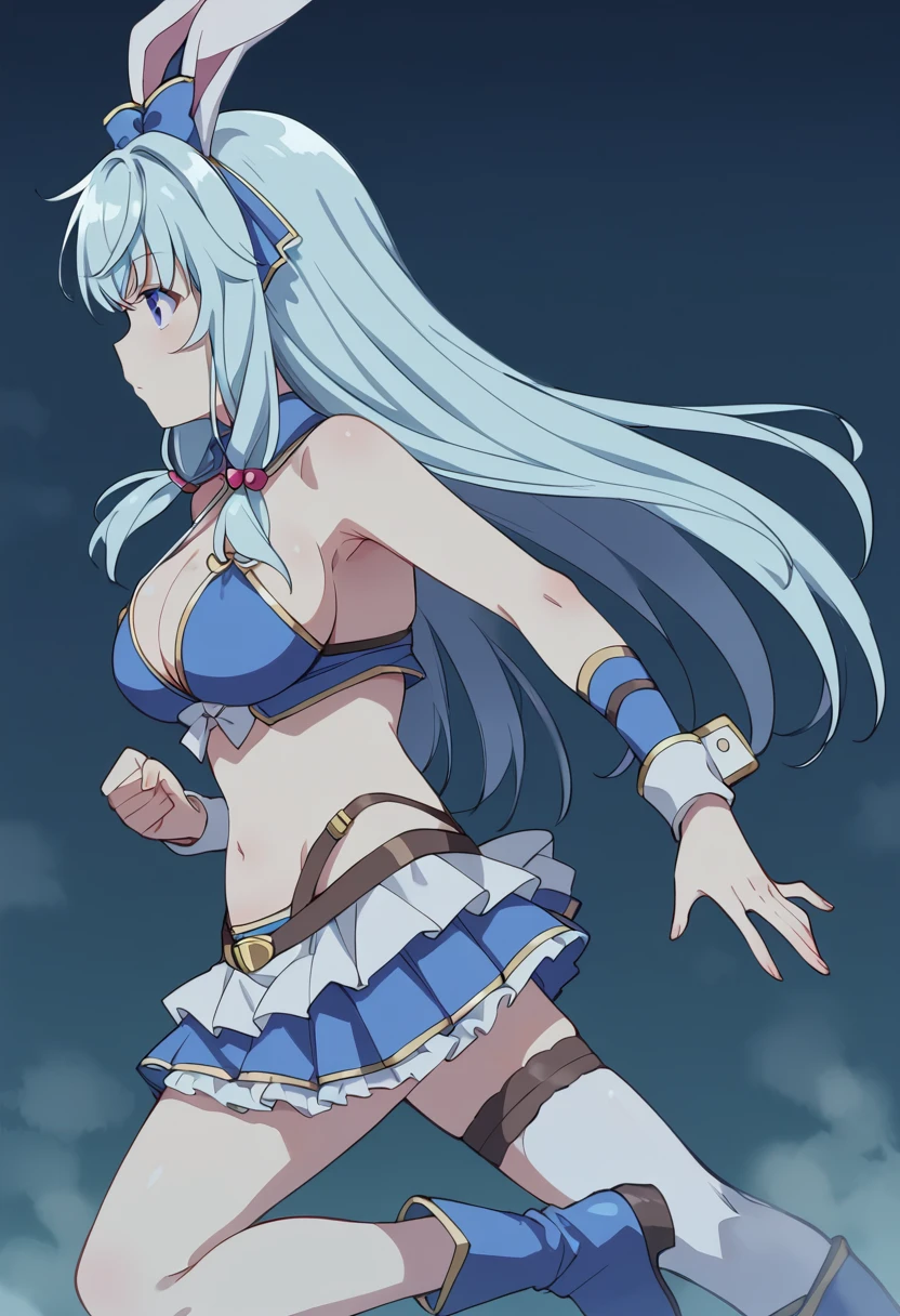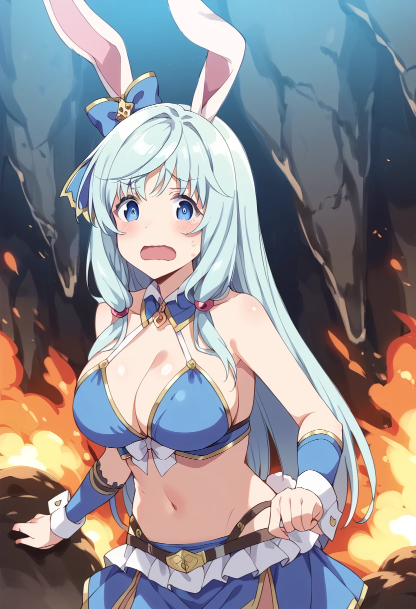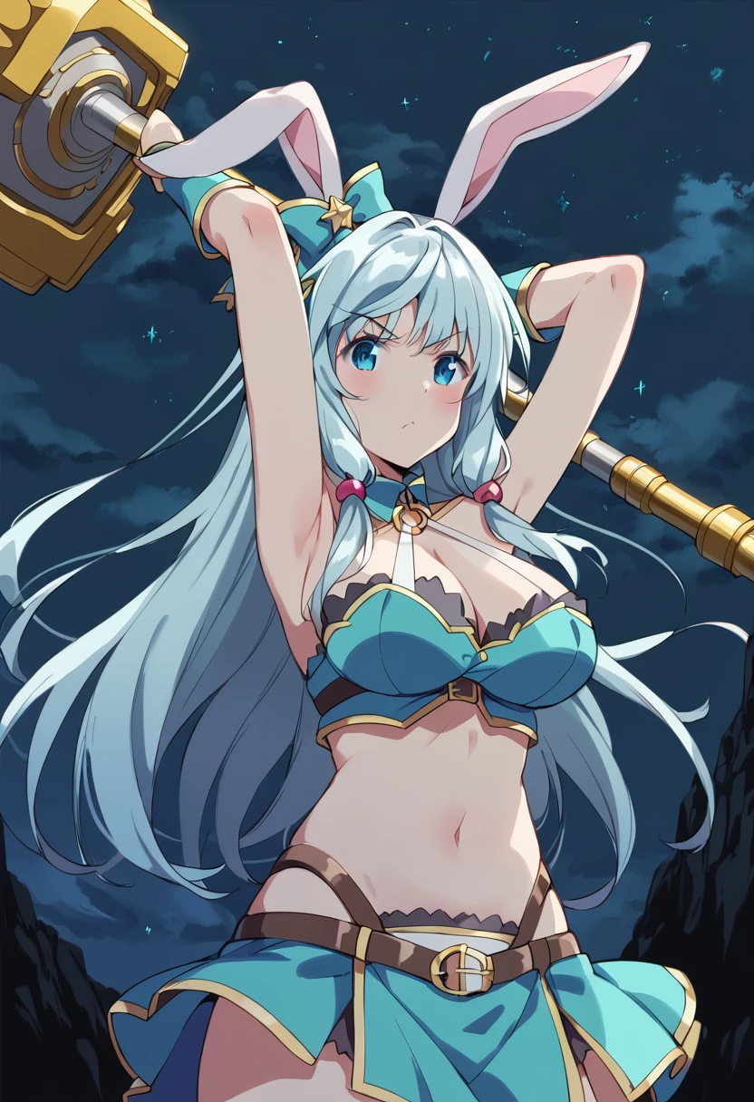 shea haulia, season-two, rabbit girl, aqua hair, silver hair, light blue hair, blue hair, sidelocks, eyebrows visible through hair, very long hair, hair between eyes, blue eyes, aqua eyes, large breasts, rabbit ears, rabbit tail, blue bikini, bikini top, front-tie top, gold trim, hair ribbon, hair bow, blue ribbon, hair ornament, halterneck, detached collar, brooch, blue skirt, miniskirt, microskirt, pleated skirt, bikini skirt, showgirl skirt, underwear, white panties, highleg panties, wrist cuffs, detached sleeves, belt, thigh strap, leg garter, single thighhigh, uneven legwear, white legwear, frills, blue footwear, high heel boots, bare shoulders, cleavage, midriff, navel
