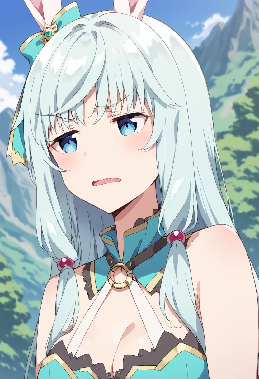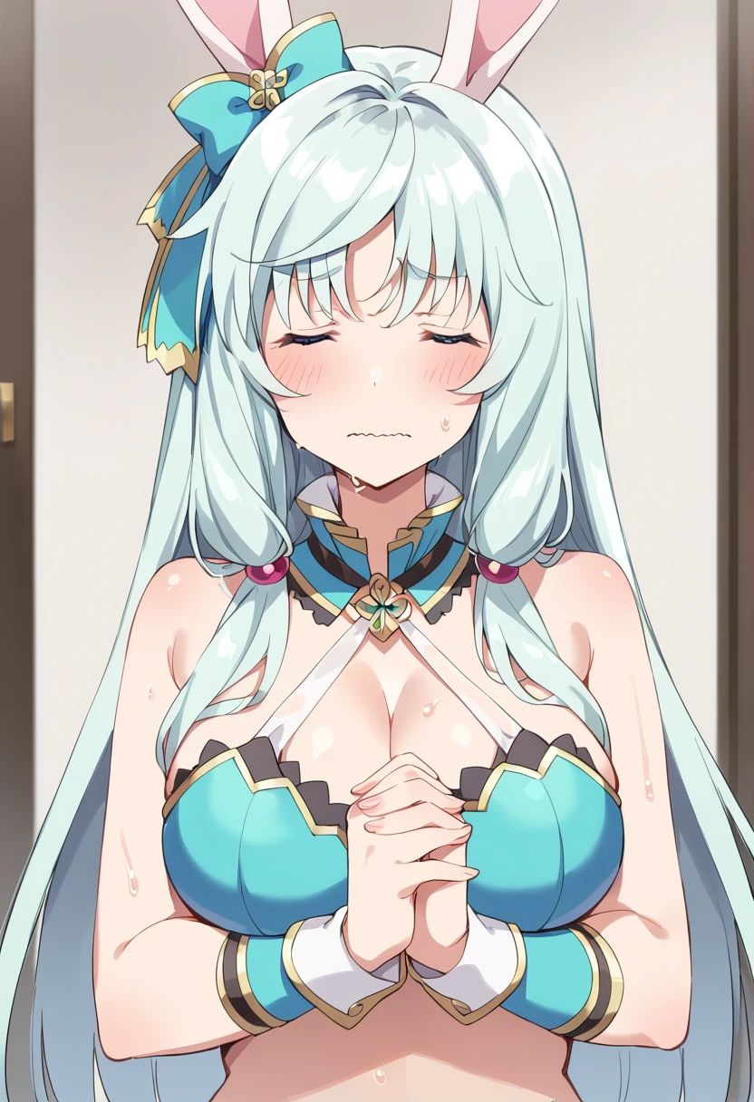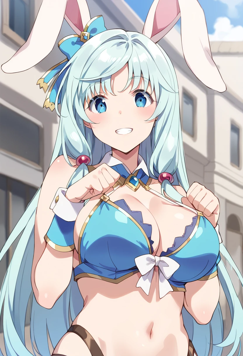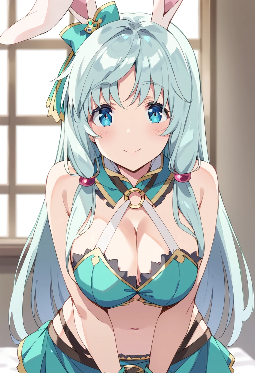 shea haulia, rabbit girl, aqua hair, silver hair, light blue hair, blue hair, sidelocks, eyebrows visible through hair, very long hair, hair between eyes, blue eyes, aqua eyes, large breasts, rabbit ears, rabbit tail