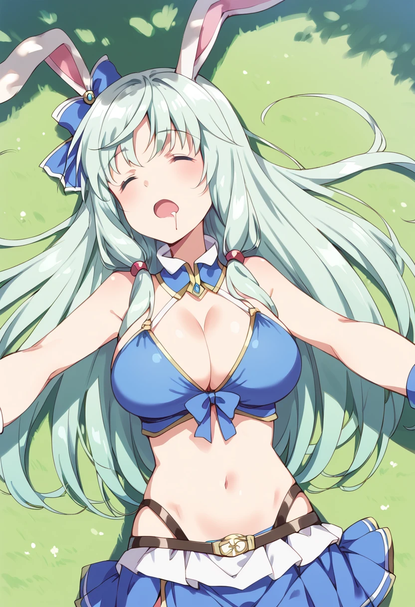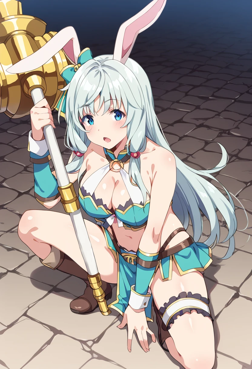 shea haulia, season-one, rabbit girl, aqua hair, silver hair, light blue hair, blue hair, sidelocks, eyebrows visible through hair, very long hair, hair between eyes, blue eyes, aqua eyes, large breasts, rabbit ears, rabbit tail, bikini armor, cleavage cutout, sleeveless, crop top, gold trim, hair ribbon, hair bow, blue bow, hair ornament, hair tubes, halterneck, criss-cross halter, detached collar, o-ring top, green skirt, miniskirt, underwear, white panties, highleg panties, wrist cuffs, vambraces, belt, thigh strap, leg garter, knee boots, white footwear, bare shoulders, cleavage, midriff, navel2nd season outfit / アニメ2期の服装