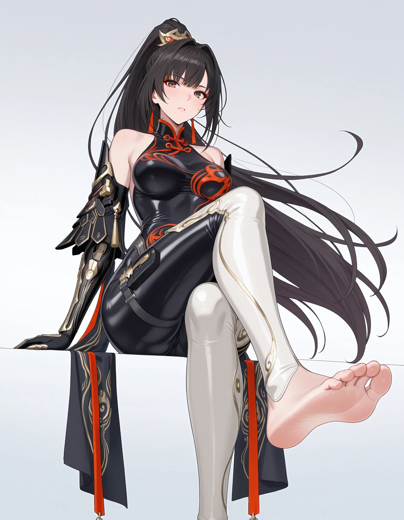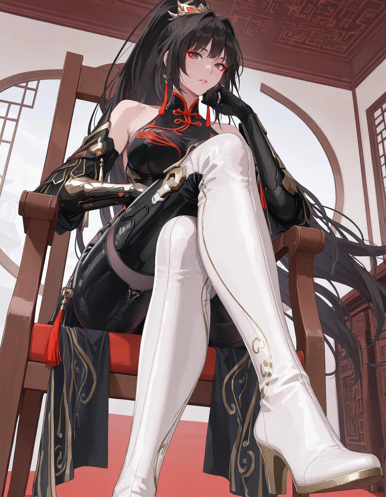 mai_pgr_qu_qm_lqgy,brown_eyes,red_eyeshadow,very_long_hair,high_ponytail,black_hair,mature_female,(aged_up:1.5),hair_ornament,bodysuit,bare_shoulders,gloves,mechanical_arms,pantyhose,boots,black_bodysuit,chinese_clothes,thigh_boots,white_footwear,tassel,gold_trim,holding_swordRecommend preferred Strength: 0.7~1.
