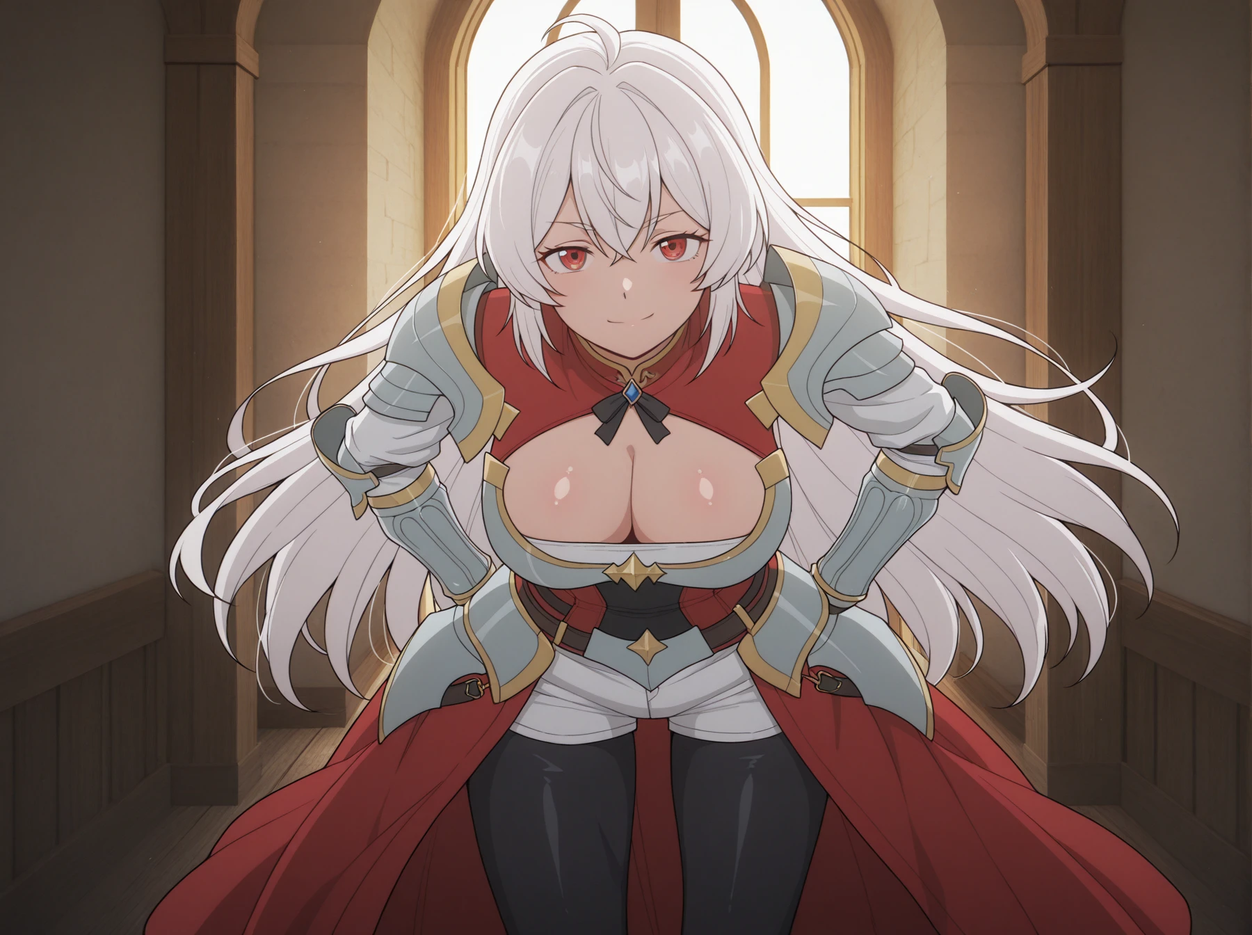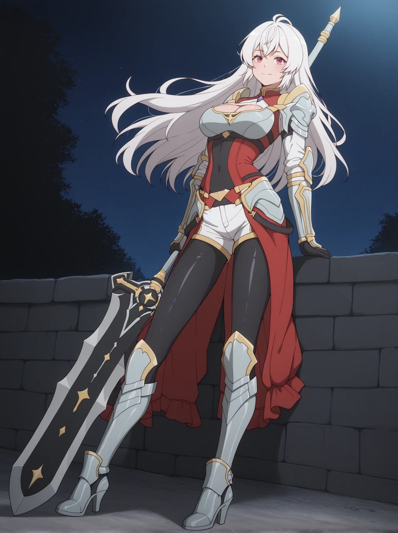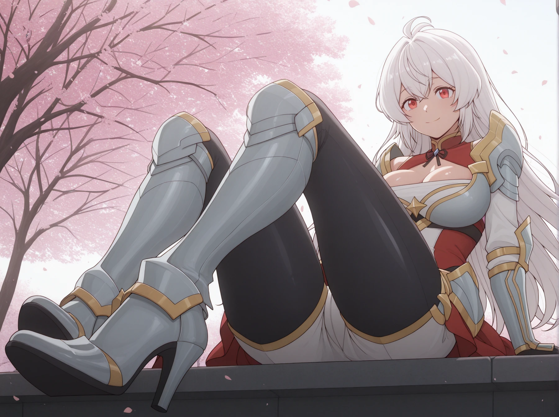 Clothes: (armor, white shorts, black leggings, metal boots, high heel boots, cleavage cutout)
