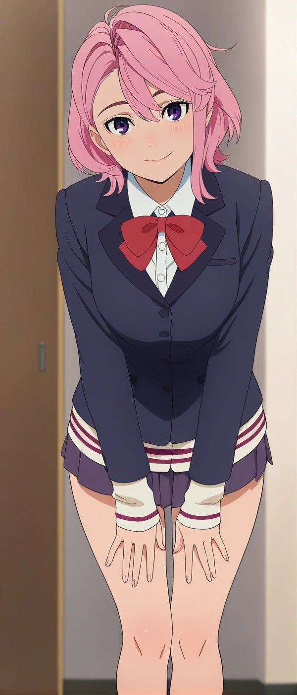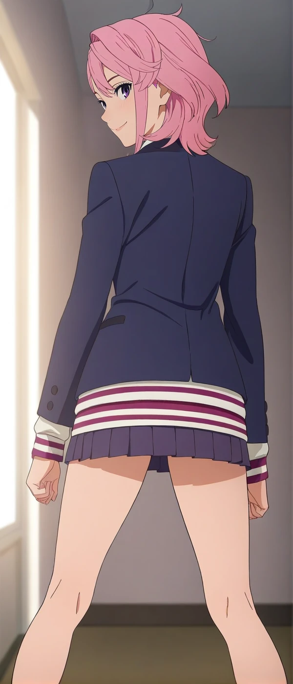 anime coloring, shirt, white shirt, collared shirt, bowtie, jacket, blue jacket, skirt, purple skirt, long sleeves, sleeves past wrists, socks, white socks,