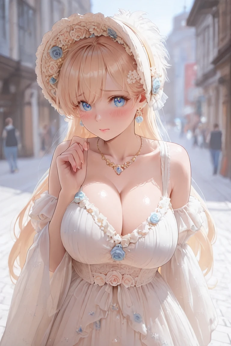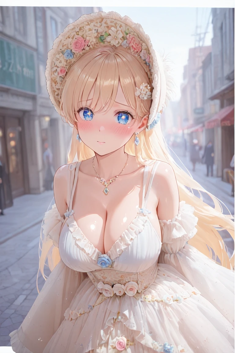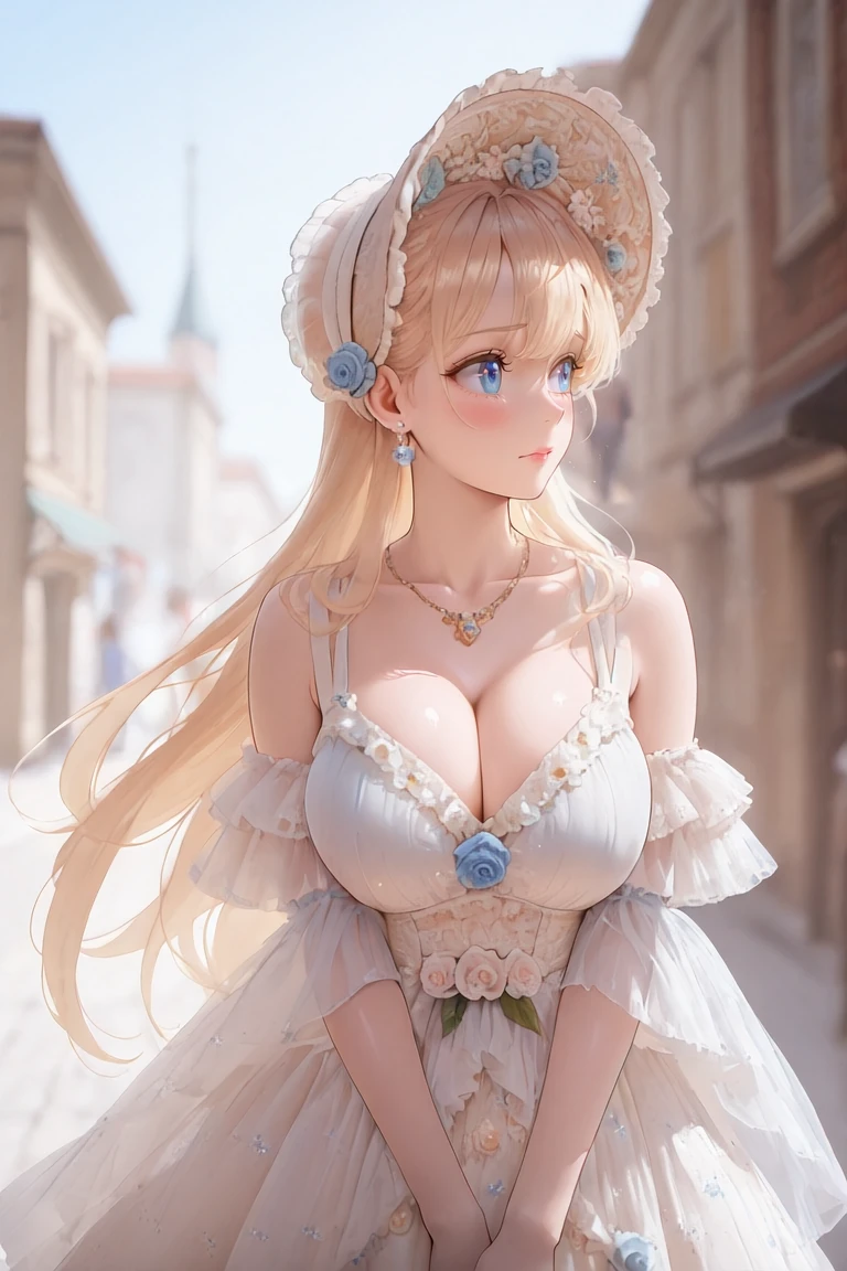 jewelry,necklace,white dress,detached sleeves,hair ornament,long dress,frills,sleeveless dress,earrings,wide sleeves,bonnet,dress_flower