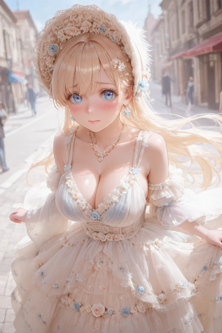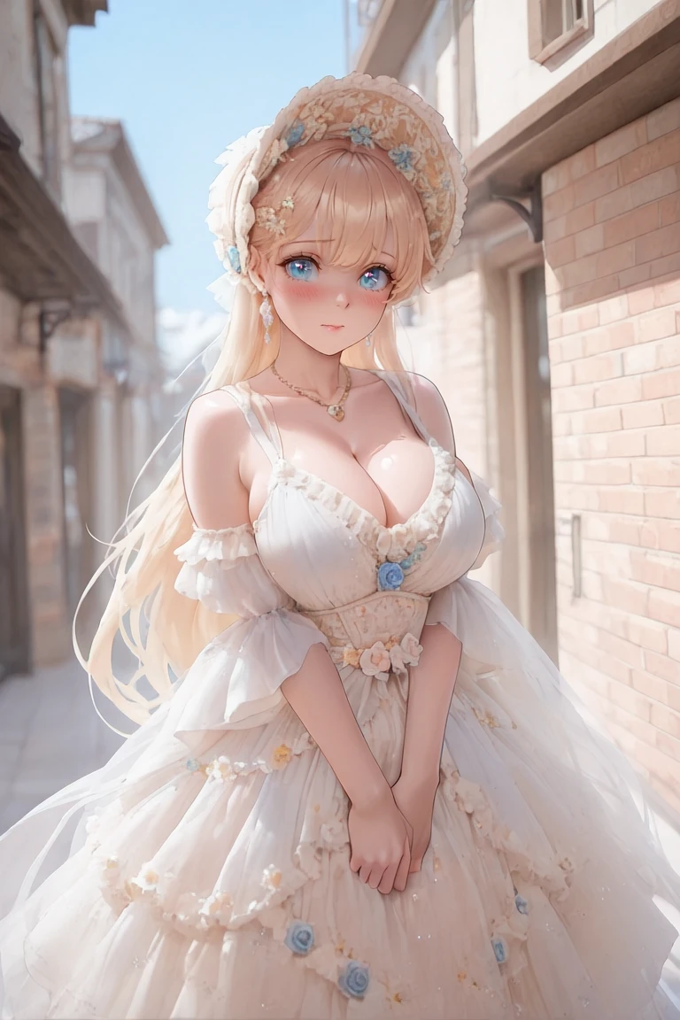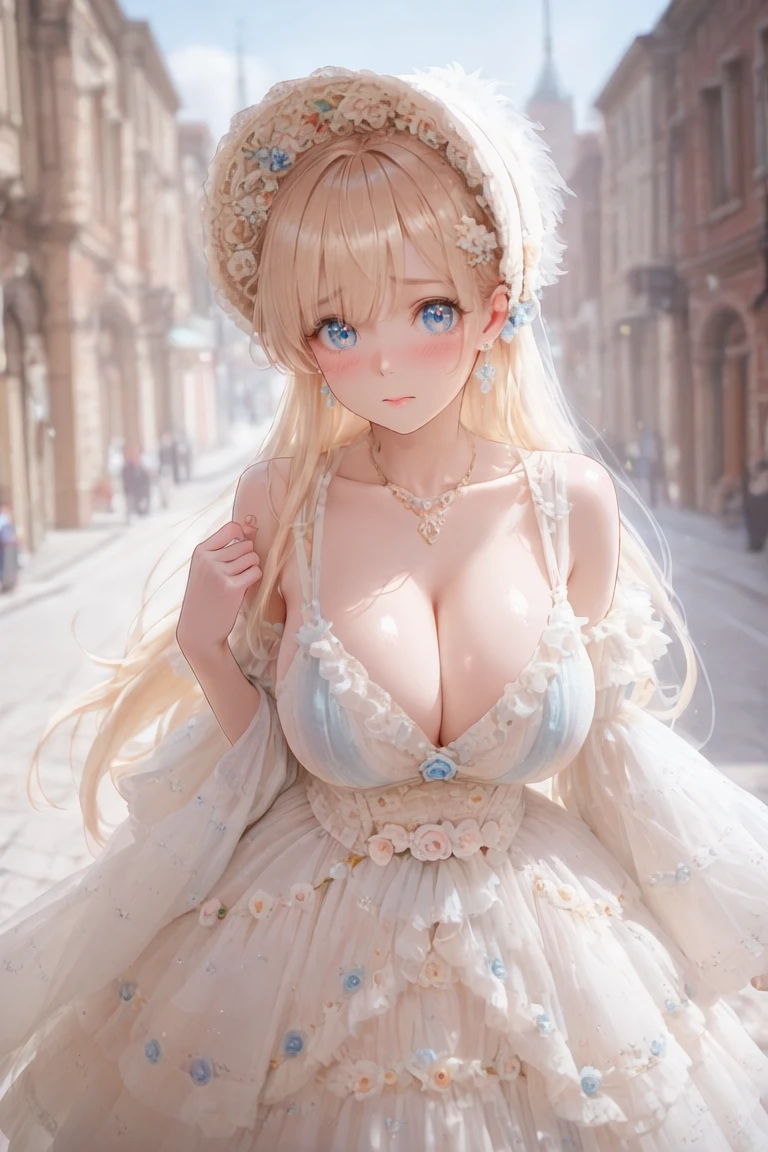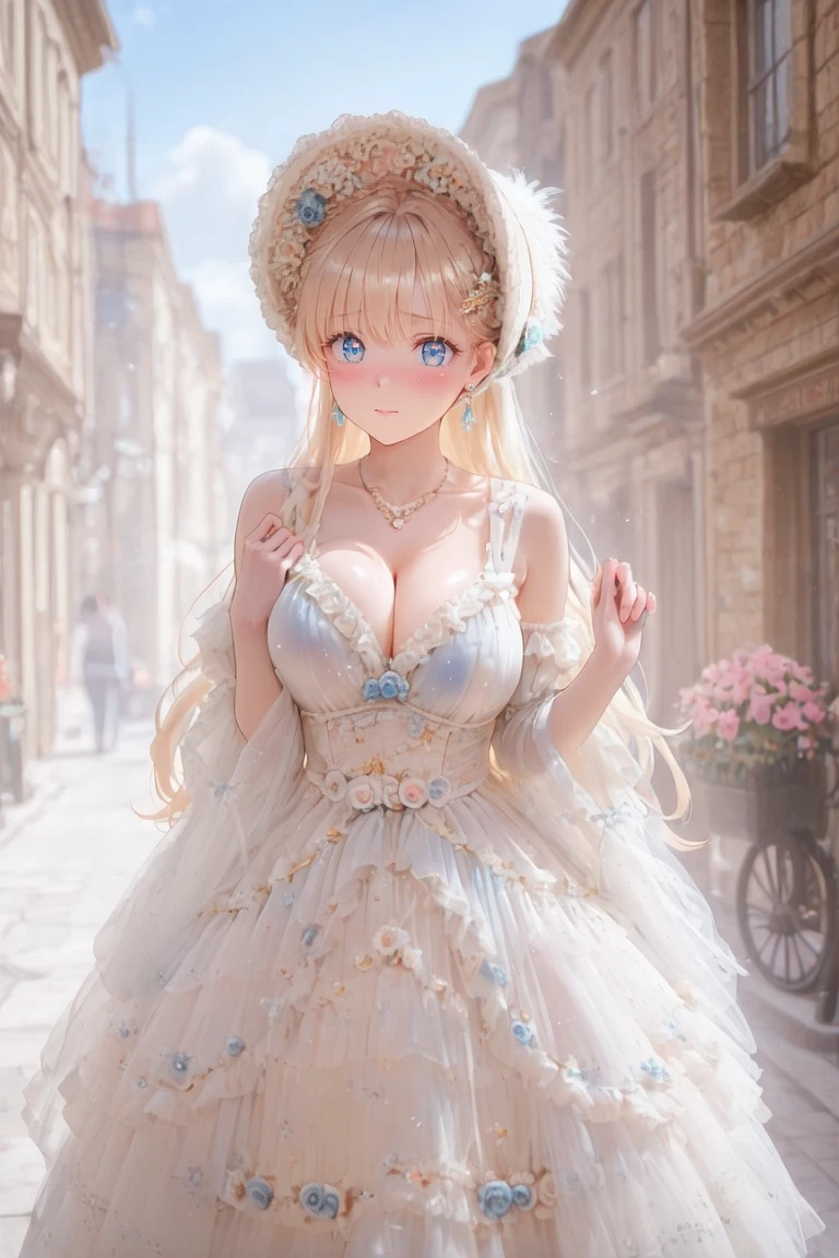 jewelry,necklace,white dress,detached sleeves,hair ornament,long dress,frills,sleeveless dress,earrings,wide sleeves,bonnet,dress_flower