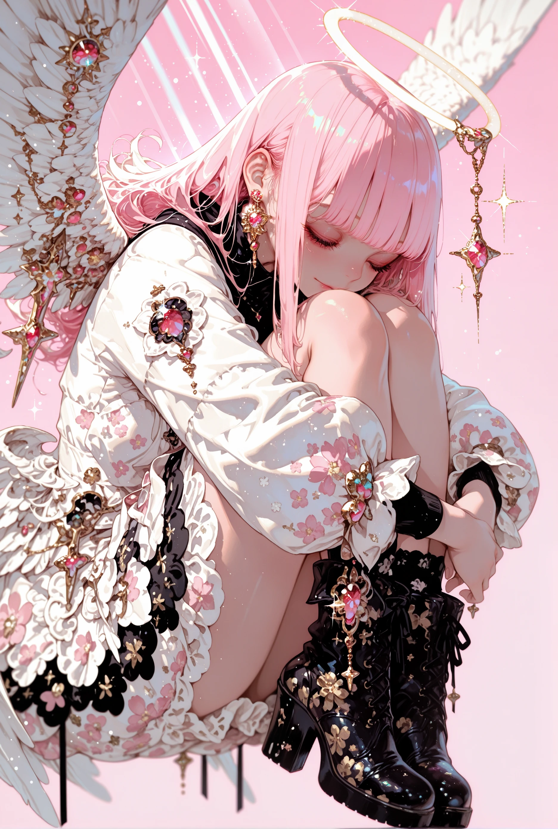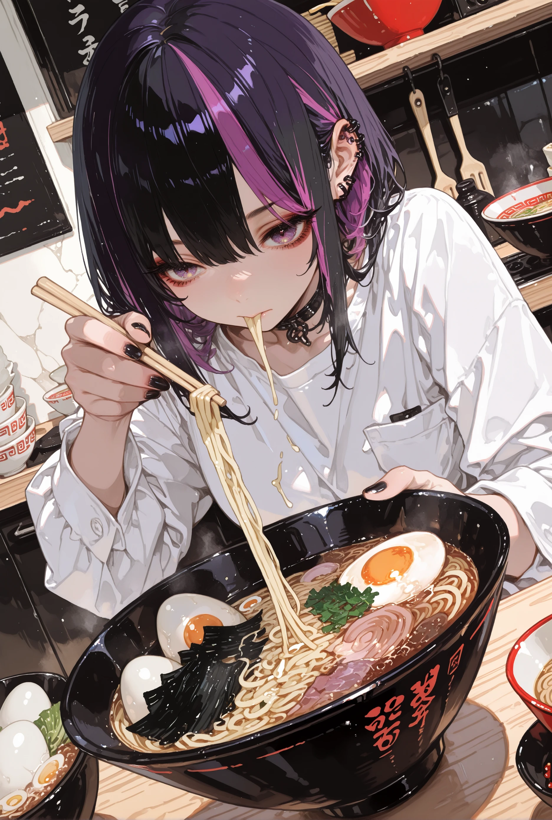 Characters feel touched by fate, warriors with kimono petals glowing around them, quiet musicians with neon hearts, angels curled softly beneath celestial gold, girls who eat ramen as if the whole universe rests in their bowl, dreamers sitting beneath impossible blue skies.
