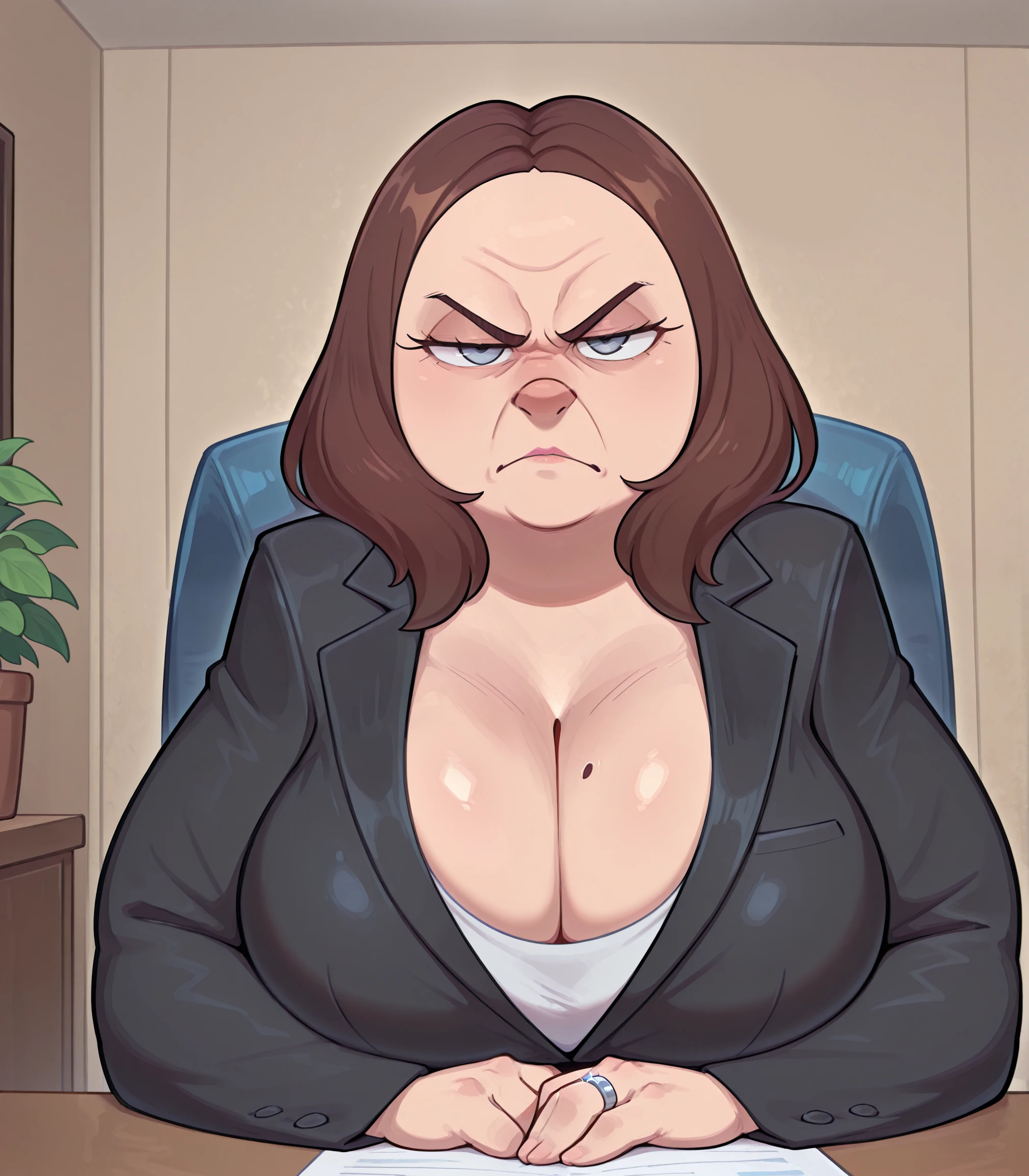 brown hair, grey eyes, upturned nose, mature female, plump female, eyebags