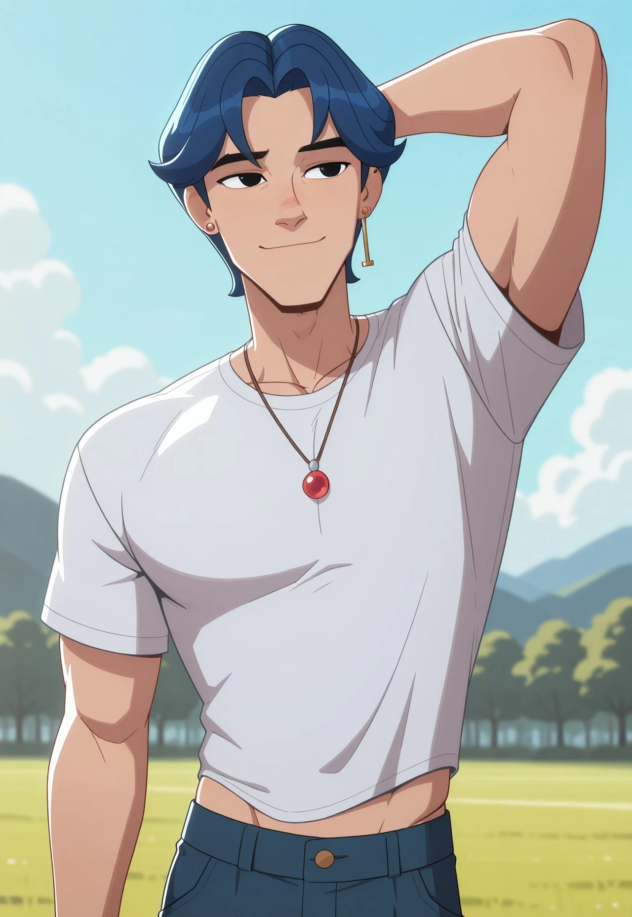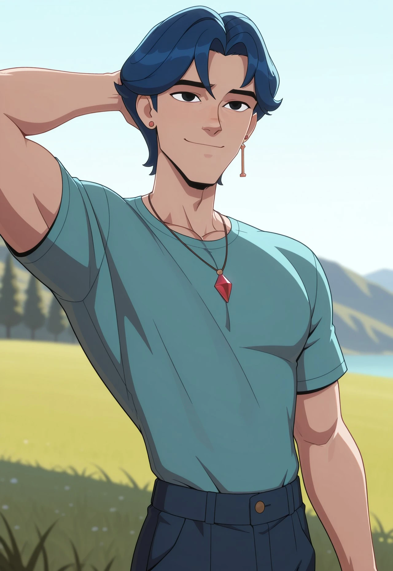 Kit, blue hair, black eyes, hair between eyes, earrings, jewelry, necklace