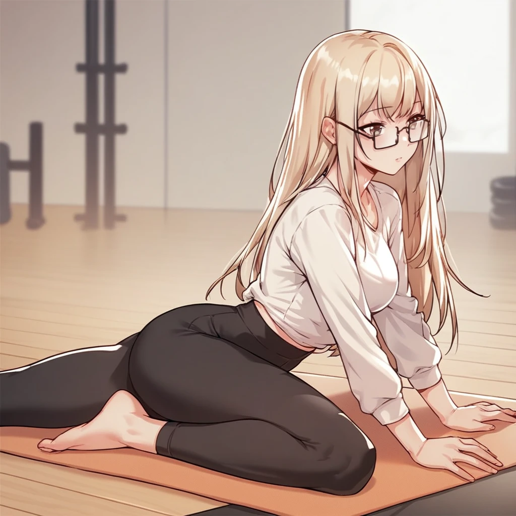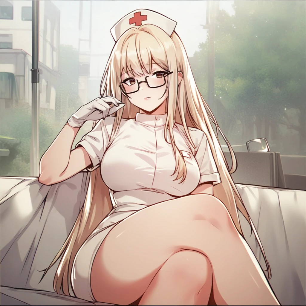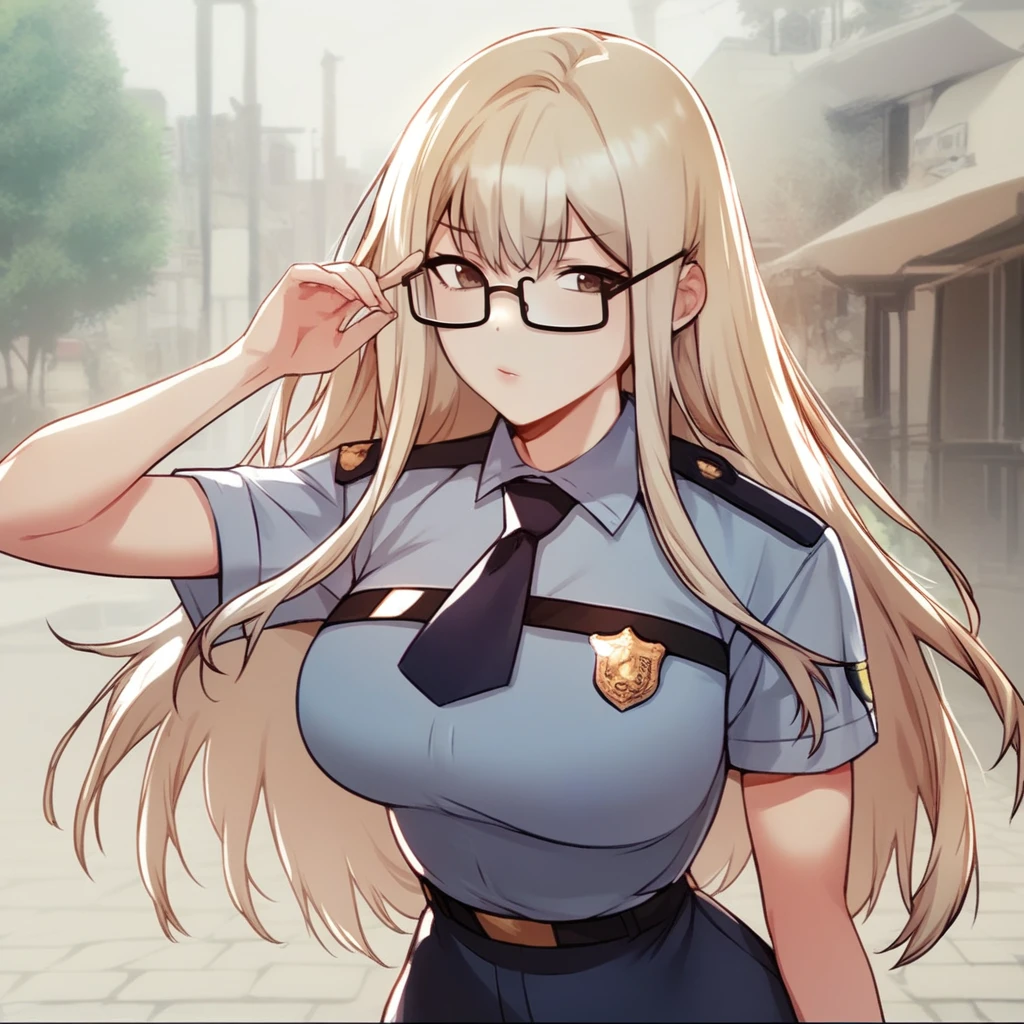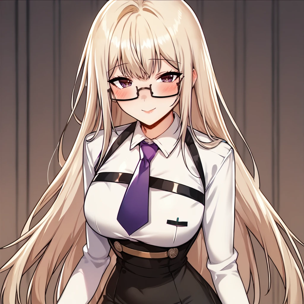 1girl, moonsoorin, bangs, blonde hair, black skirt, uniform, collared shirt, white shirt, high waist skirt, glasses, long hair, necktie,