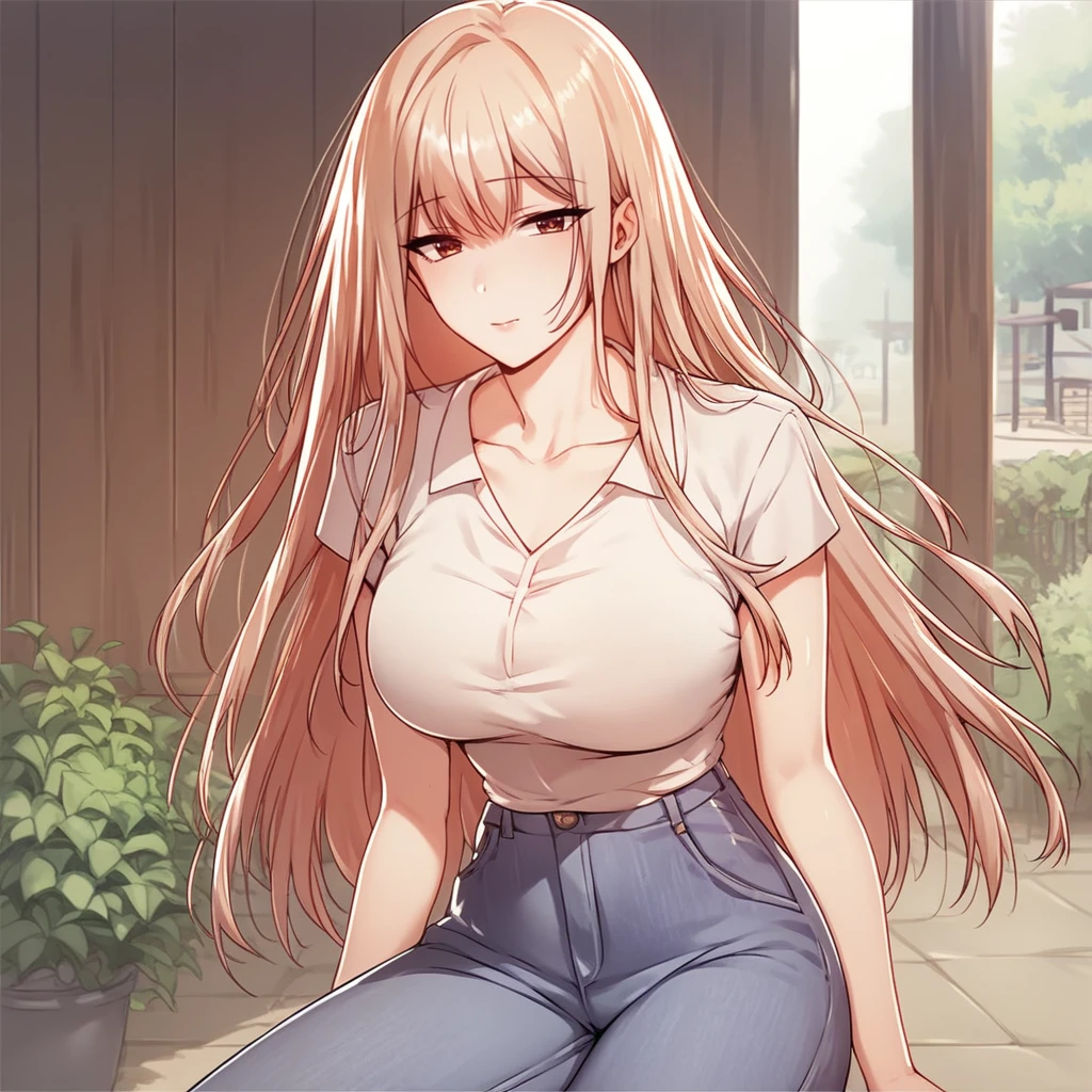 1girl, moonsoorin, solo, breasts, blonde, long hair, looking at viewer, shirt, short sleeves, pants, jeans, collarbone,