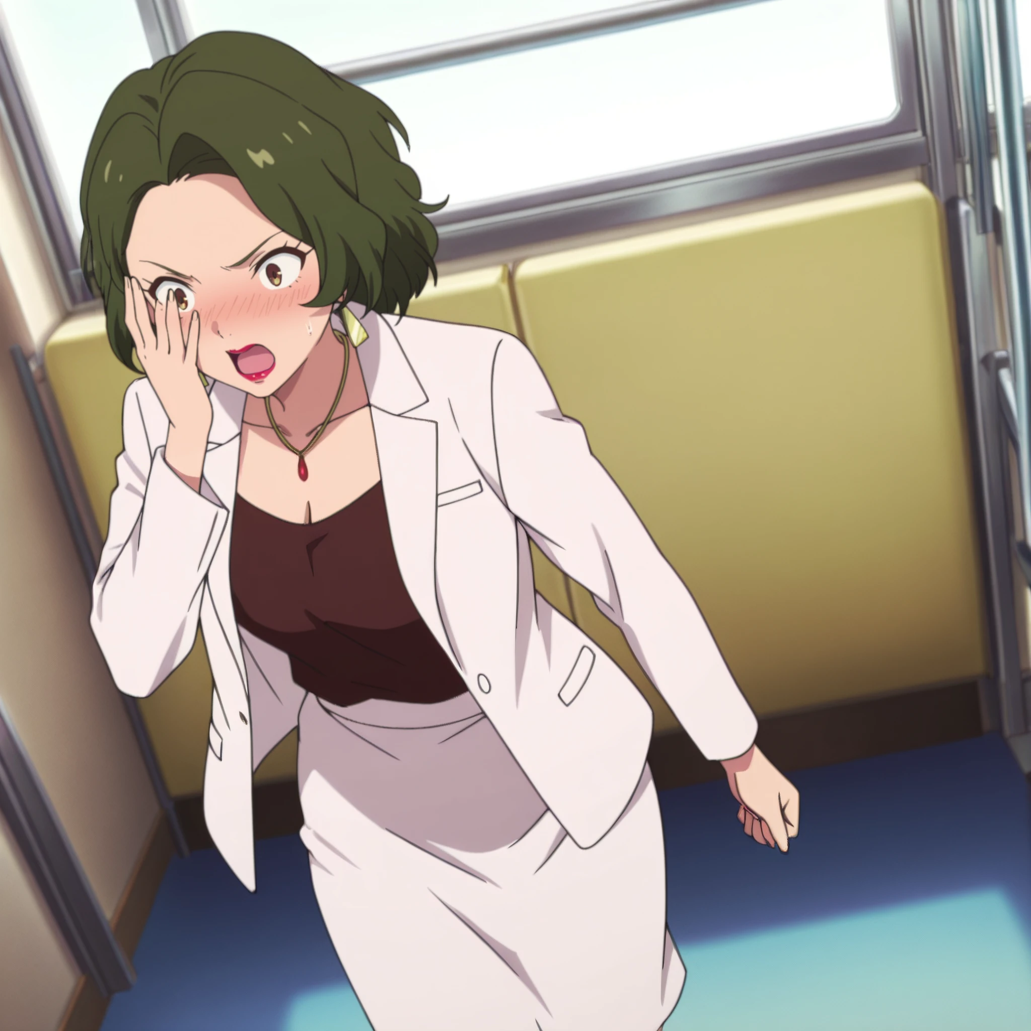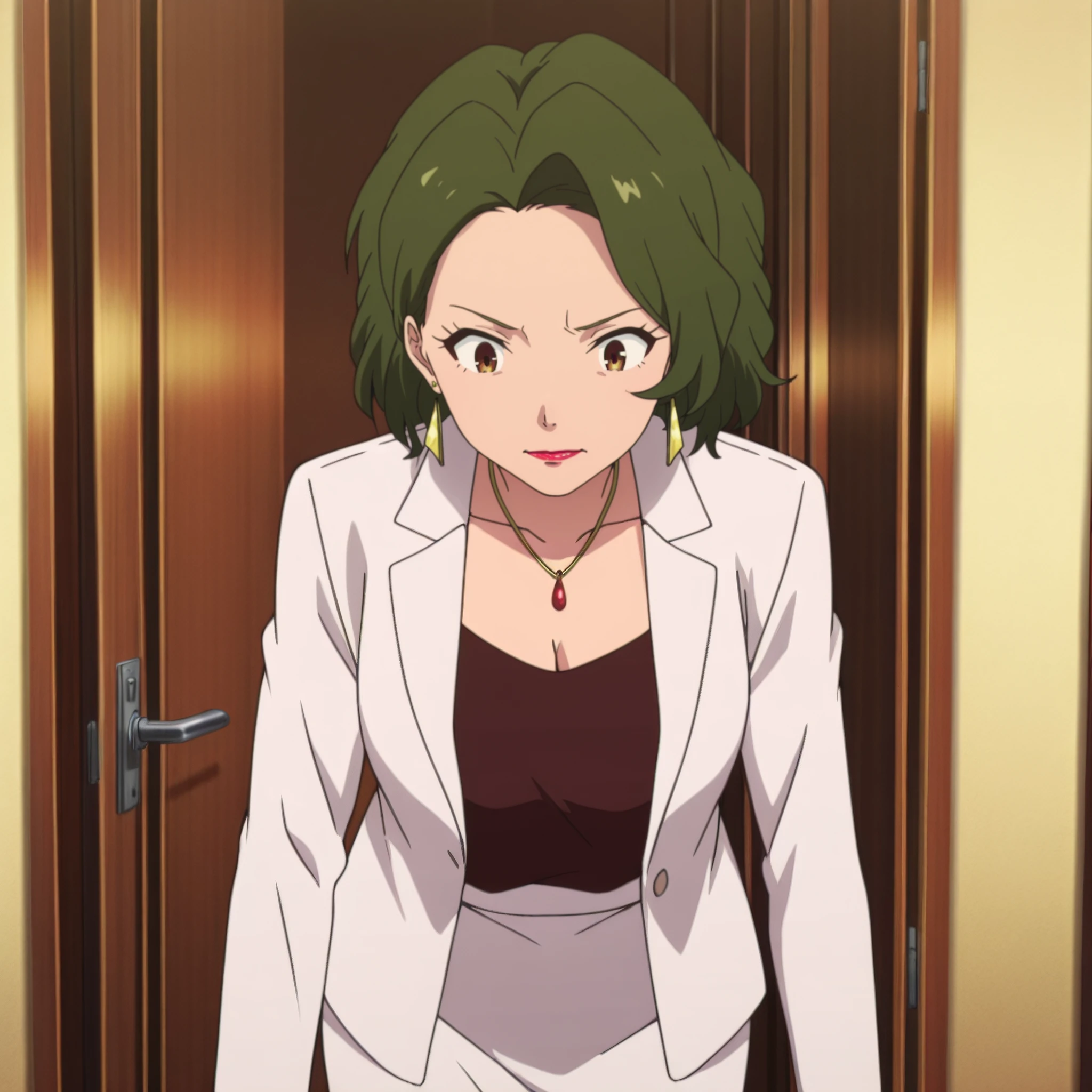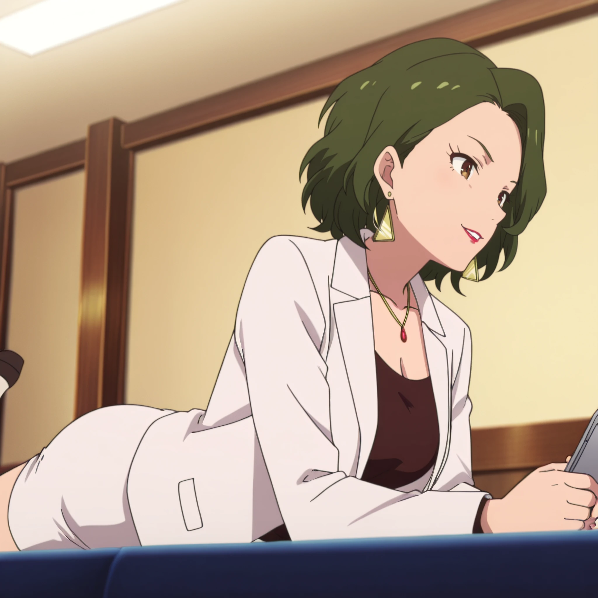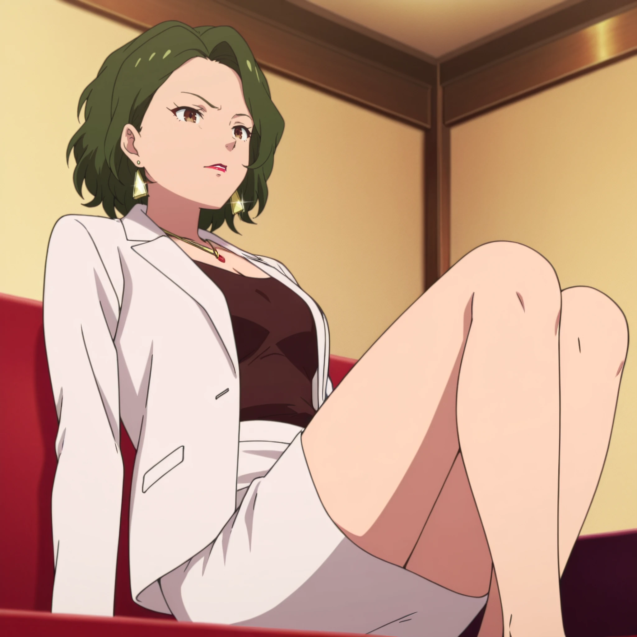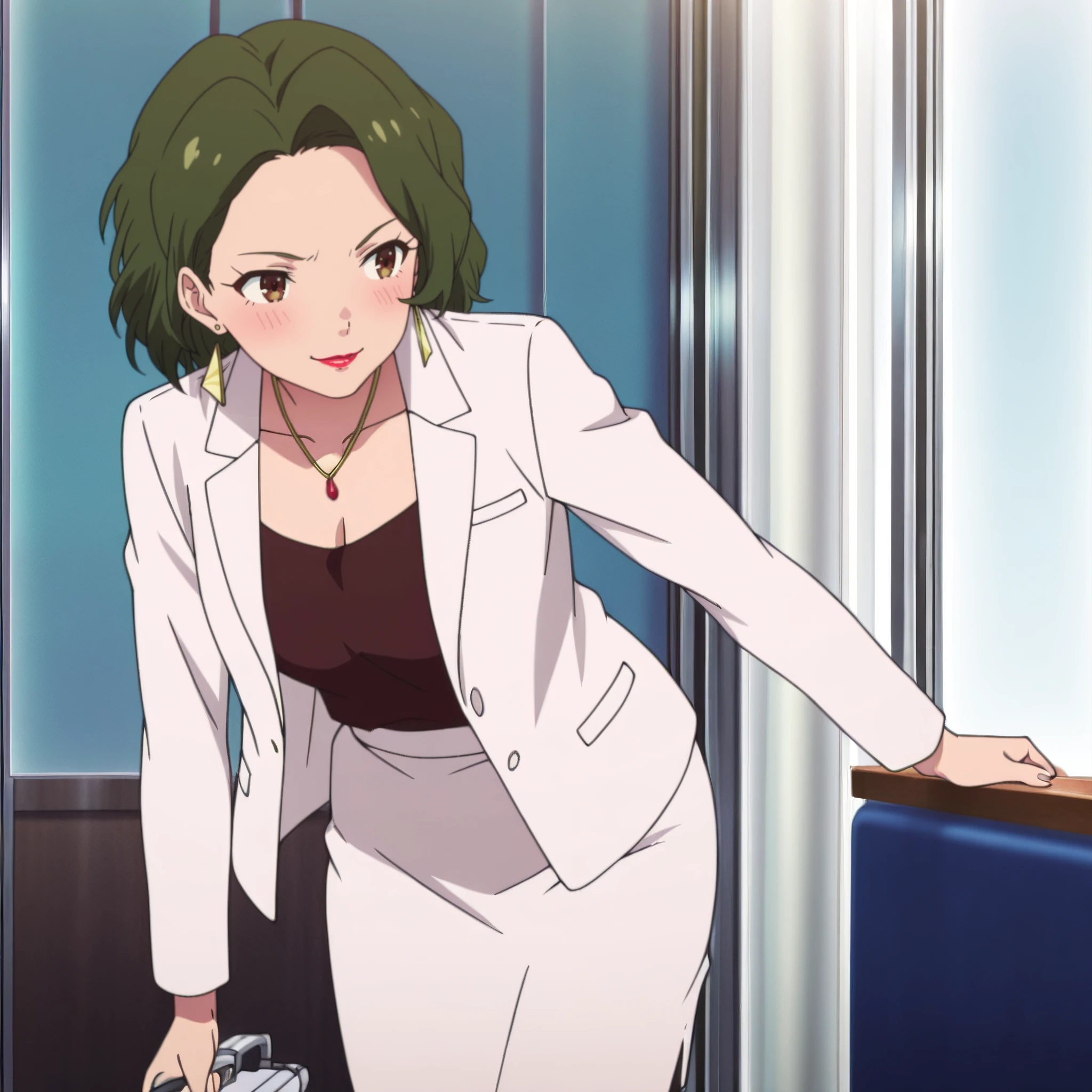shirt, cleavage, makeup, collarbone, brown shirt, white jacket, open jacket, pencil skirt, white skirt,