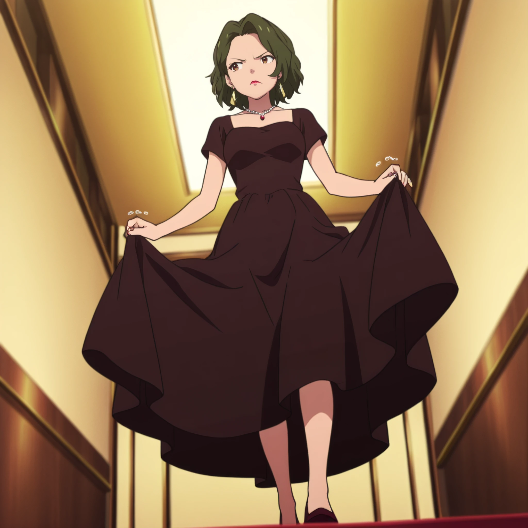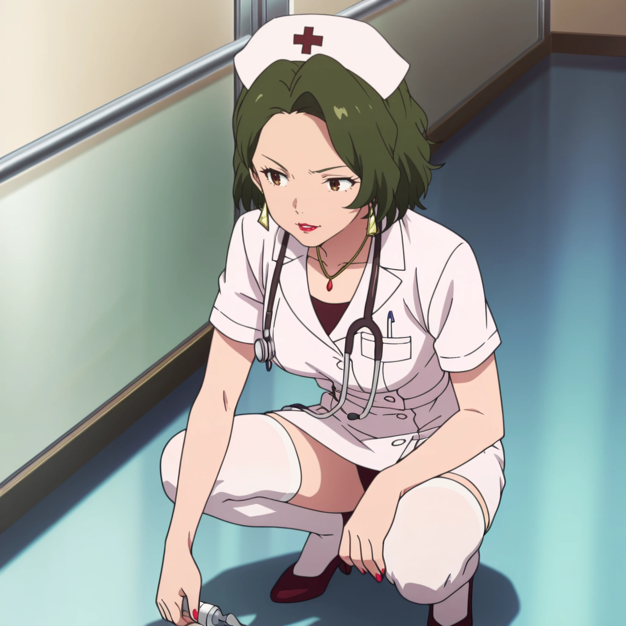 AMWTaira, short hair, green hair, brown eyes, earrings, lipstick, necklace, hoop earrings, red lips, eyelashes, bangs, pearl necklace,