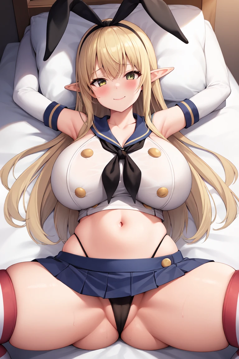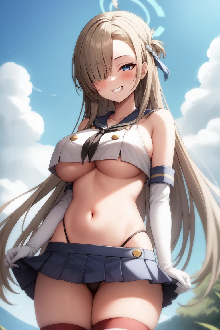 I tried to separate the outfit into many different parts to make different combinations possible. The other prompts are: crop top, thighhighs, elbow gloves, microskirt. For the panties you can use black panties, highleg panties, cameltoe. Most of the tags aren't obligatory, but will definitely help.