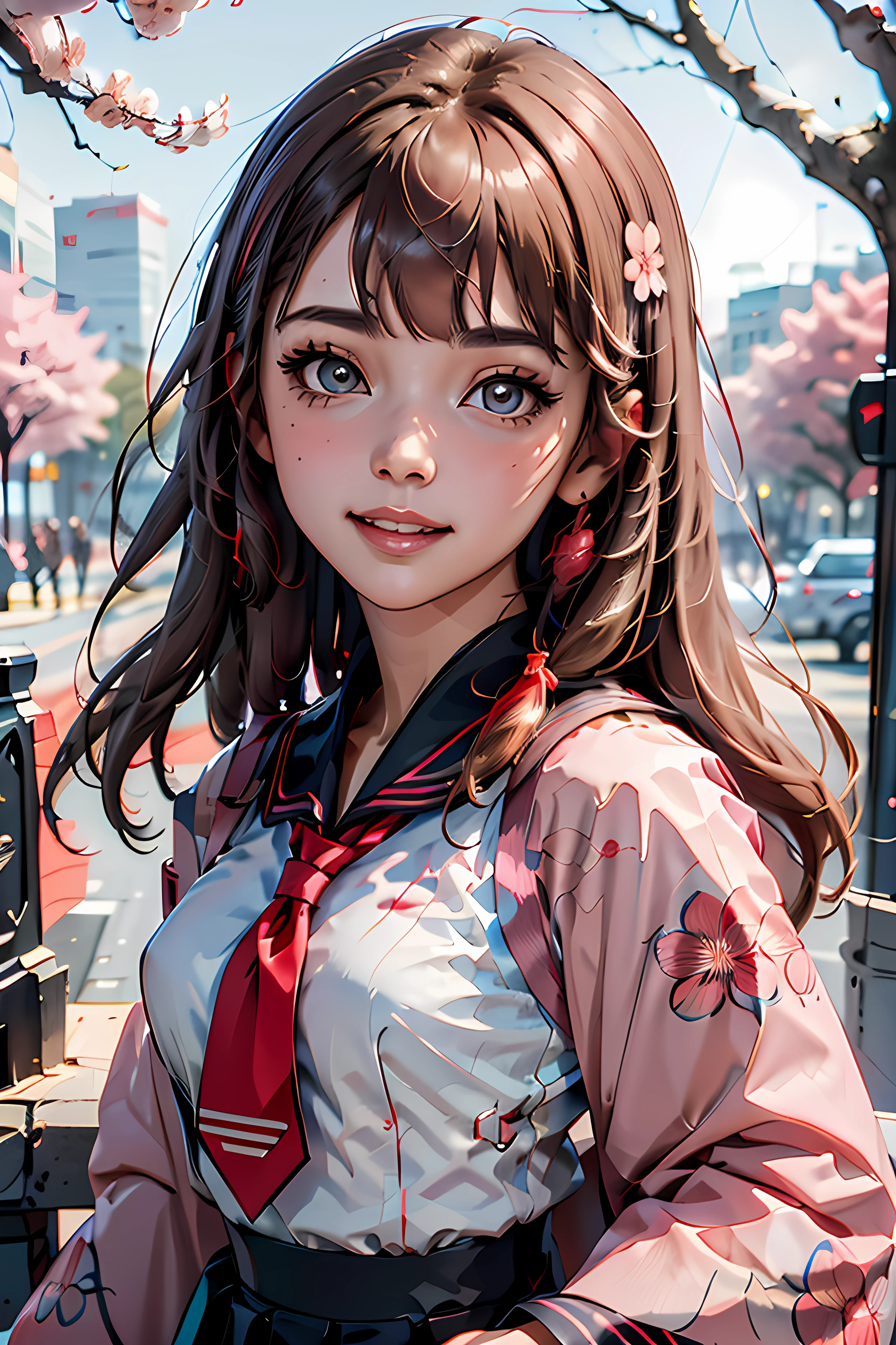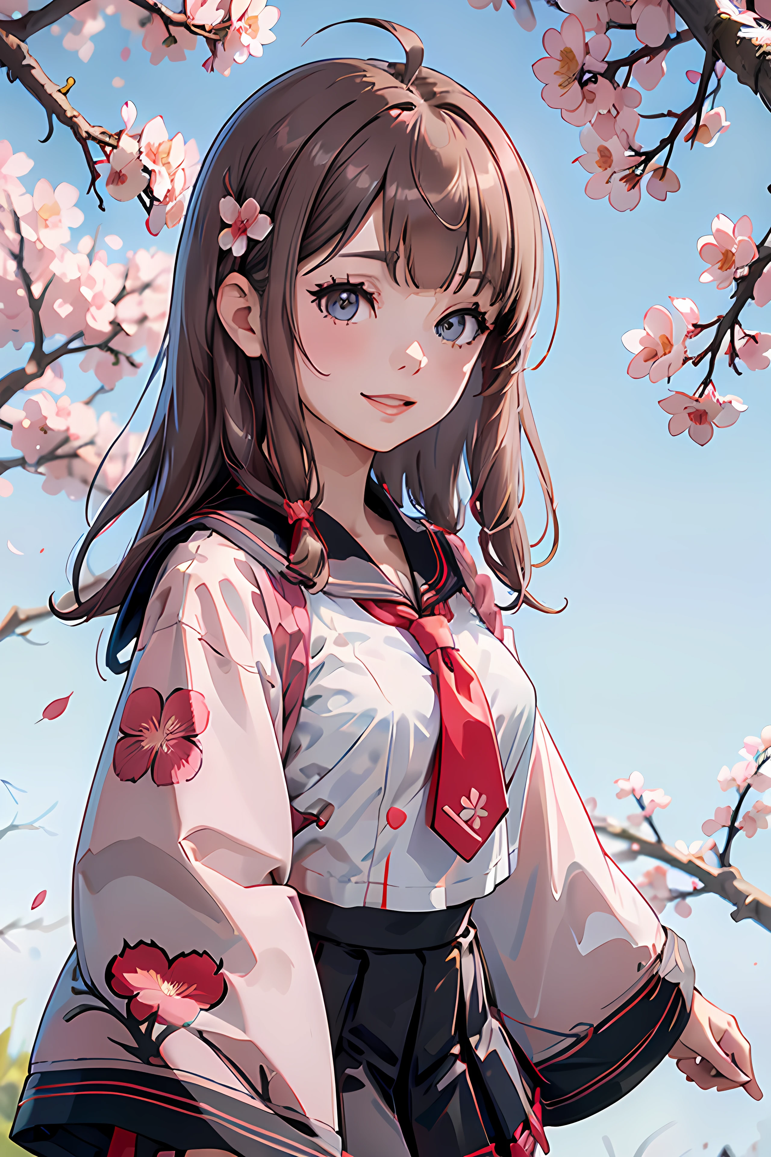 shirt, hair ornament, long sleeves, miniskirt, wide sleeves, black skirt, sailor collar, floral print, red necktie,
