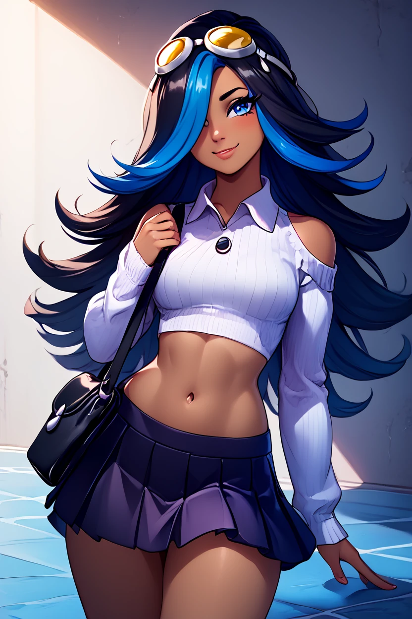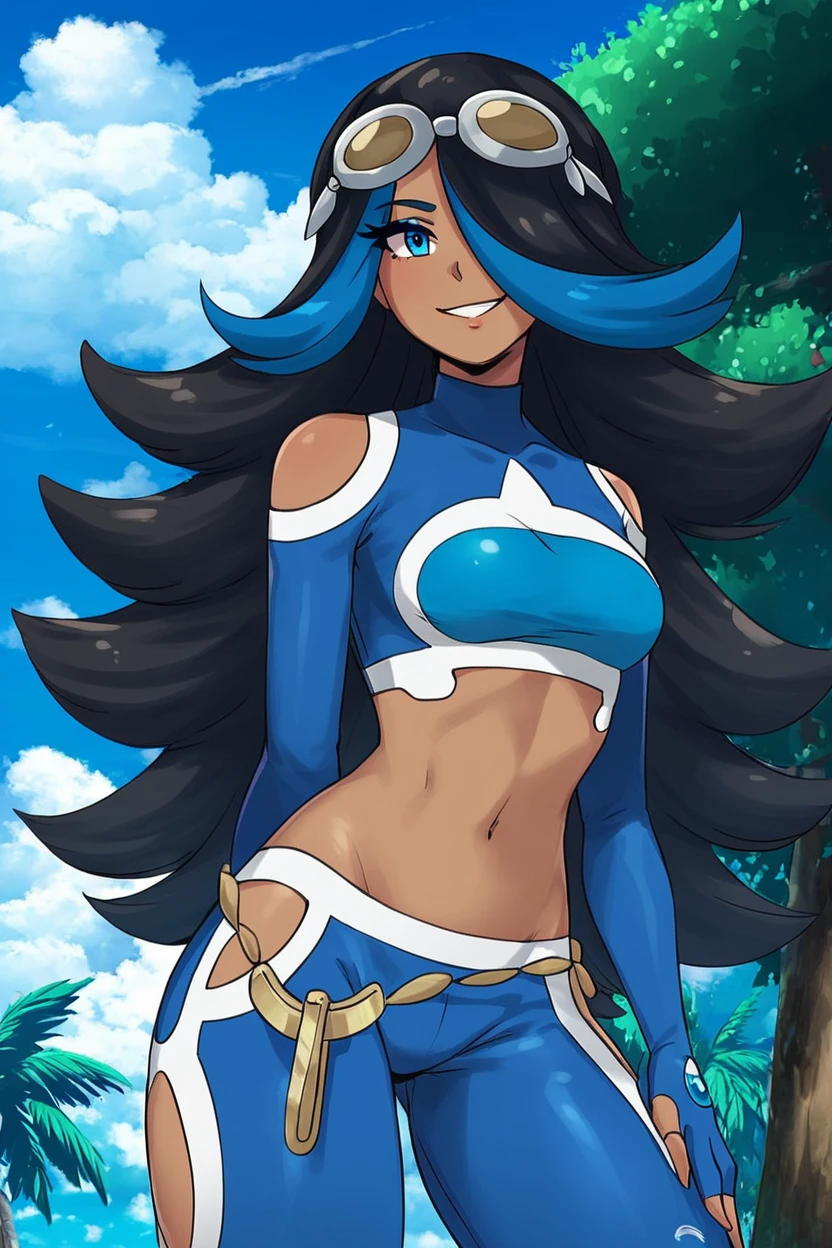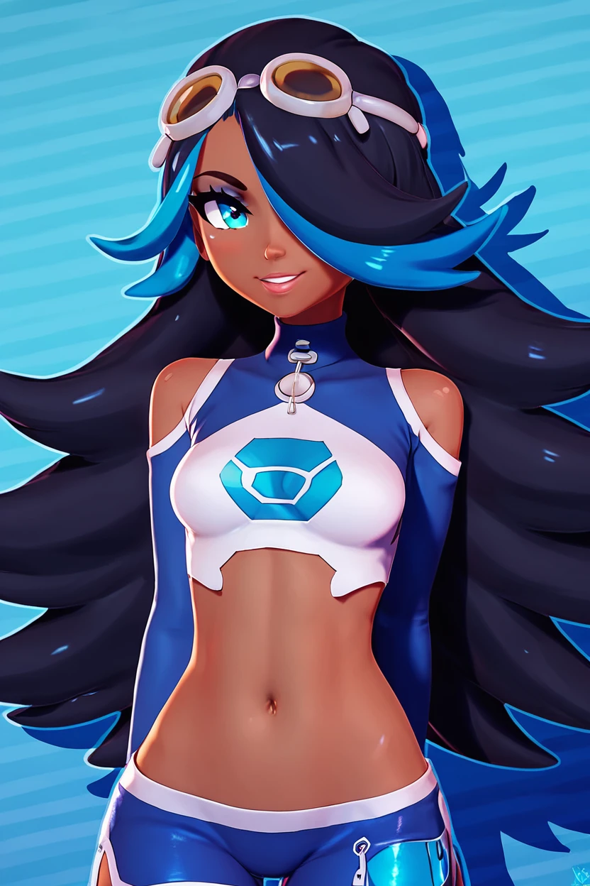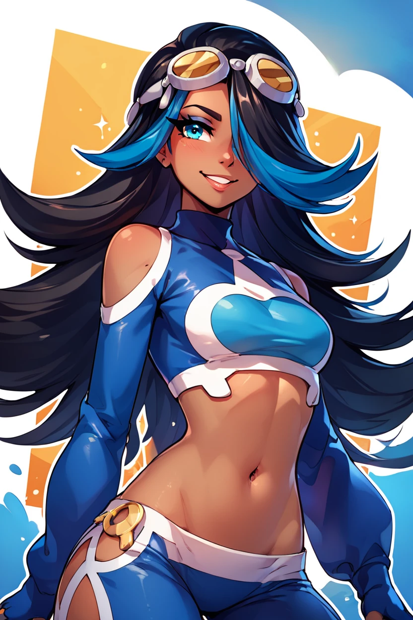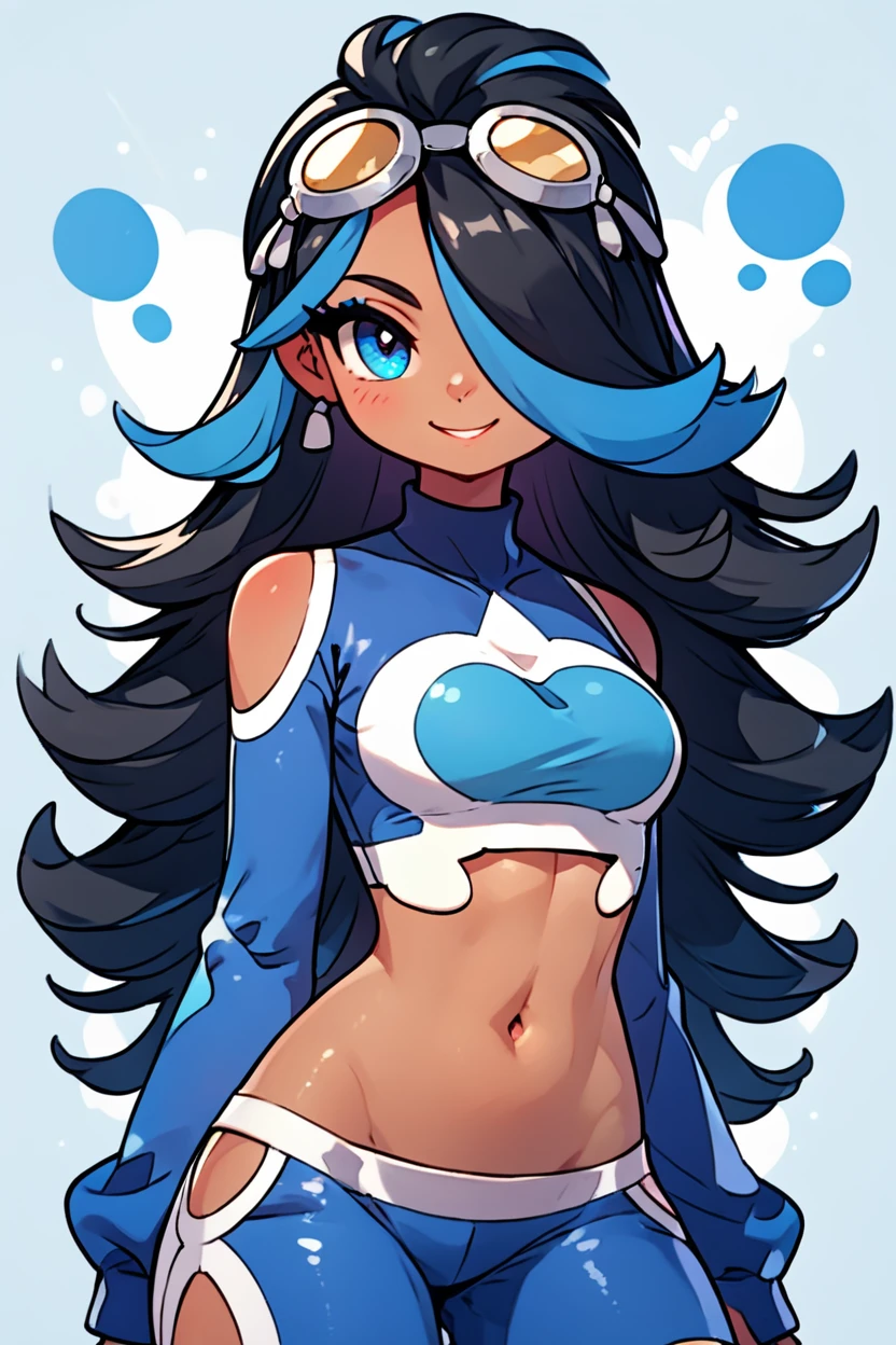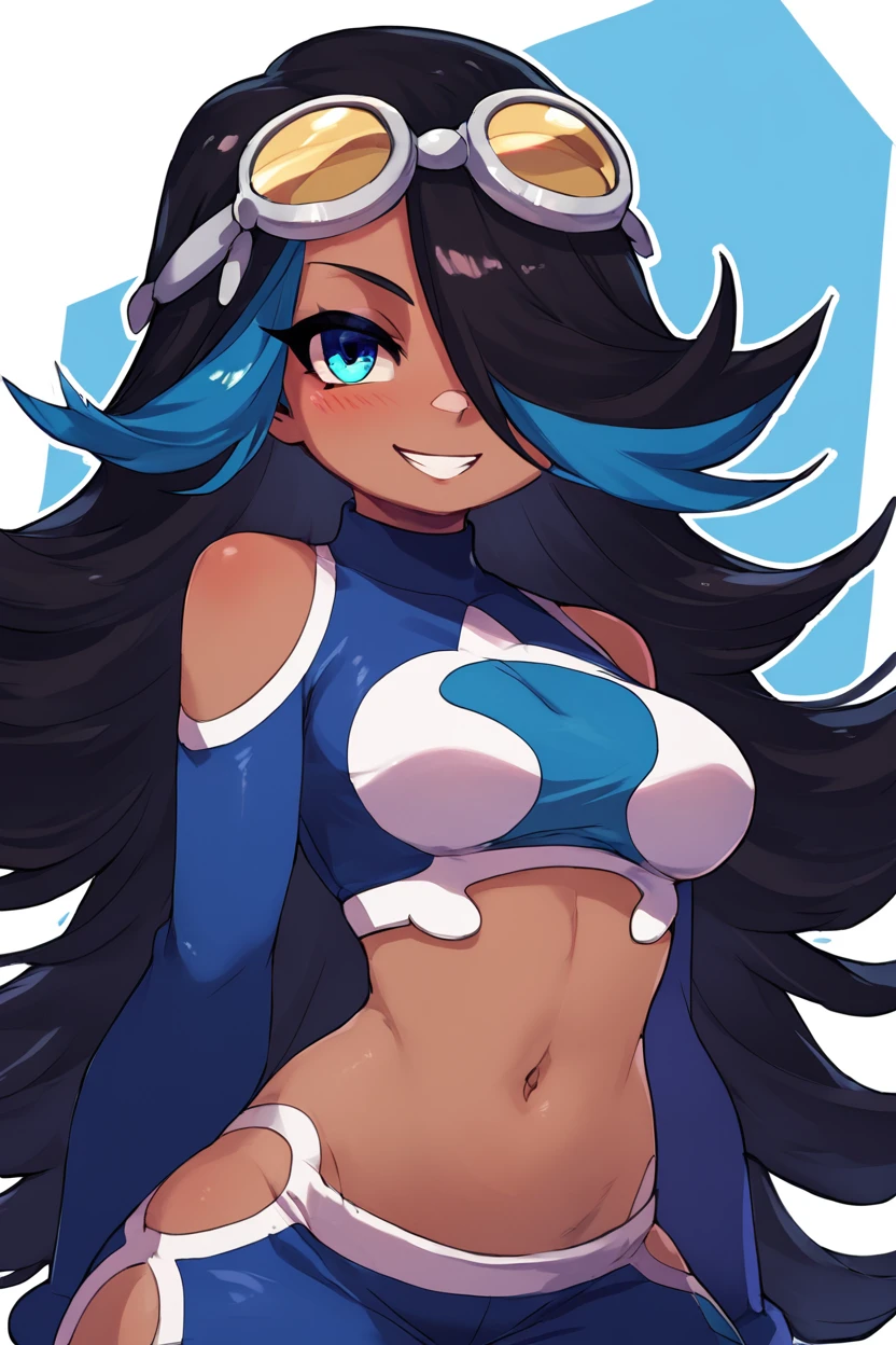 zzShelly, blue eyes, long hair, blue hair, multicolored hair, dark skin, black hair, two-tone hair, hair over one eye, goggles on head, crop top, midriff, streaked hair, shoulder cutout, navel,