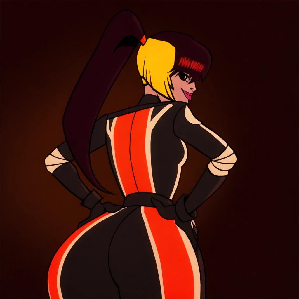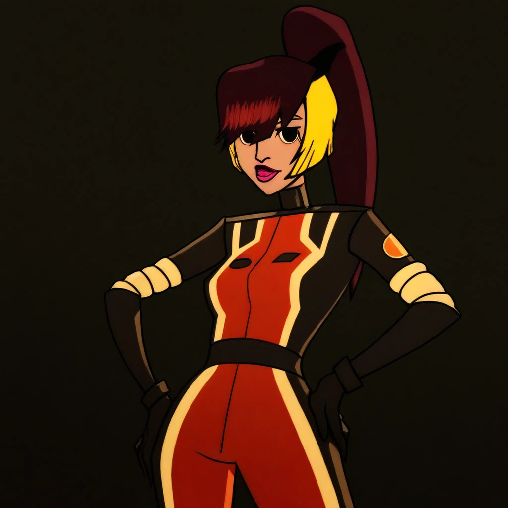 Foxy, ponytail, lipstick, multicolored hair, orange and black jumpsuit, gloves, heels,