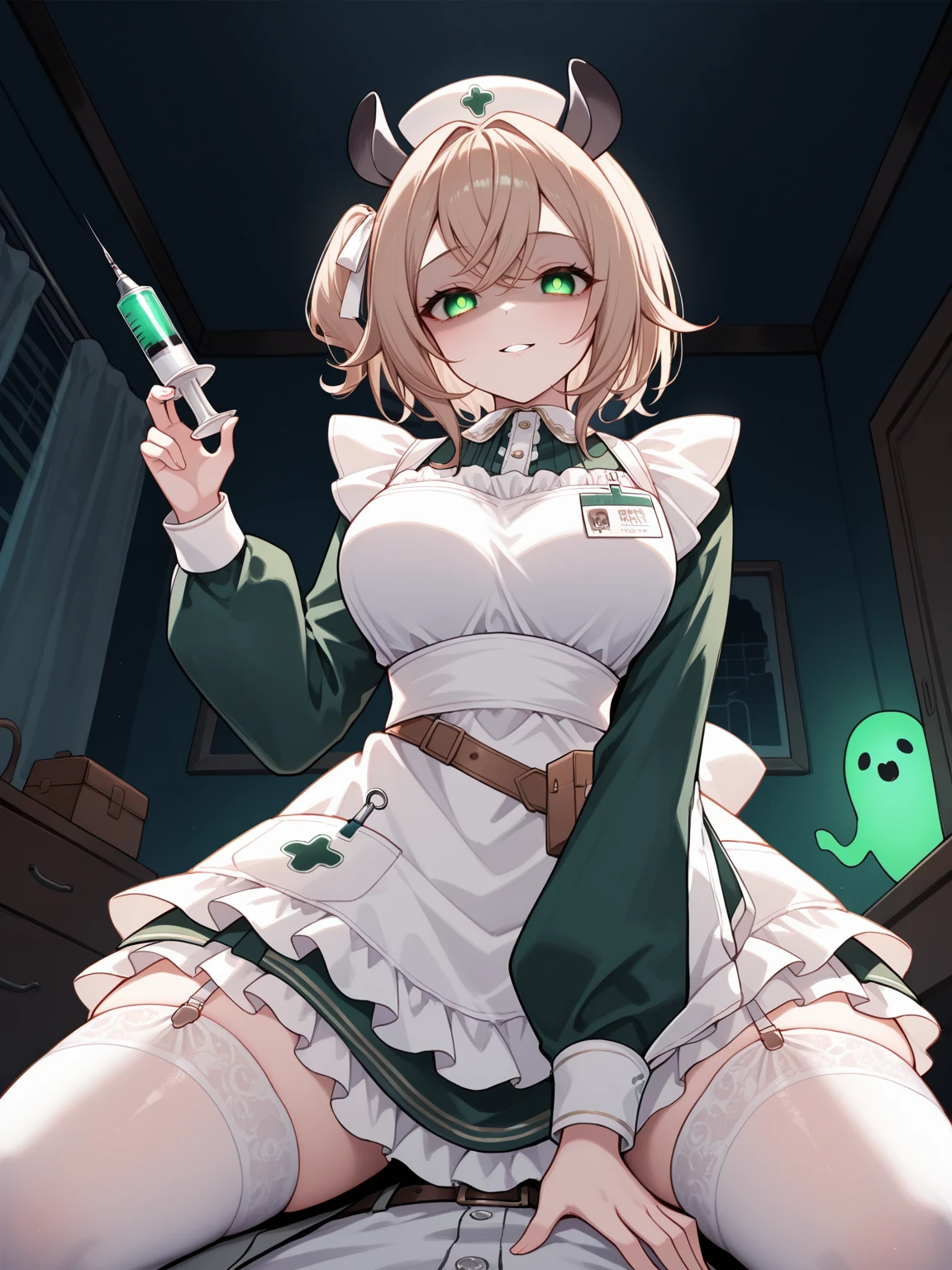 Outfit: nurse cap, green dress, collared dress, puffy long sleeves, white apron, id badge, waist bag, white thighhighs, garter straps, frilled apron, frilled dress