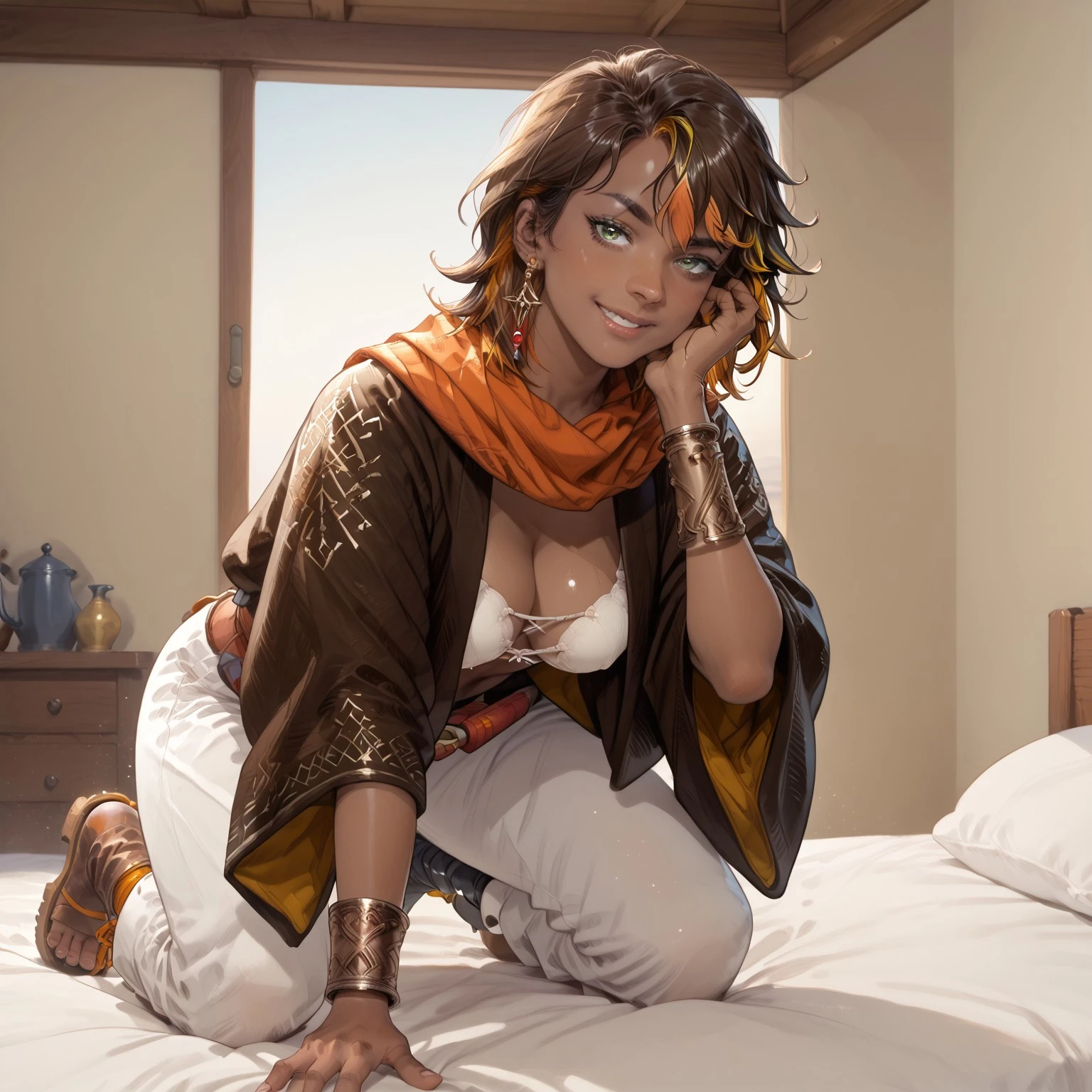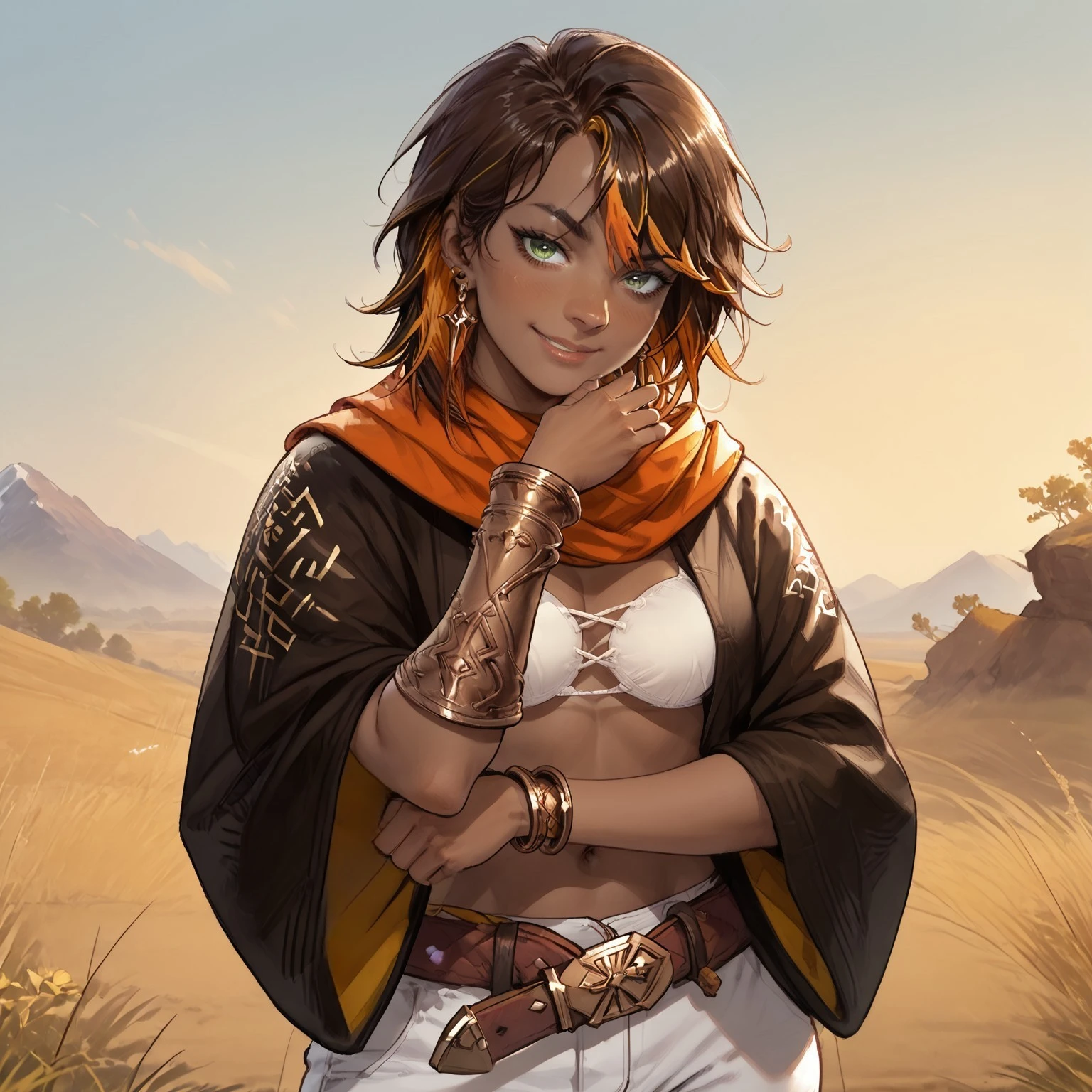 Trigger words: Homa, dark skin, dark-skinned female, green eyes, multicolored hair, two-tone hair, streaked hair, brown and orange hair, short hair, bangs, earrings, jewelry, orange scarf, brown kimono, opened kimono, white bra, breasts, cleavage, midriff, navel, bracer, belt, white pants, boots, sandals