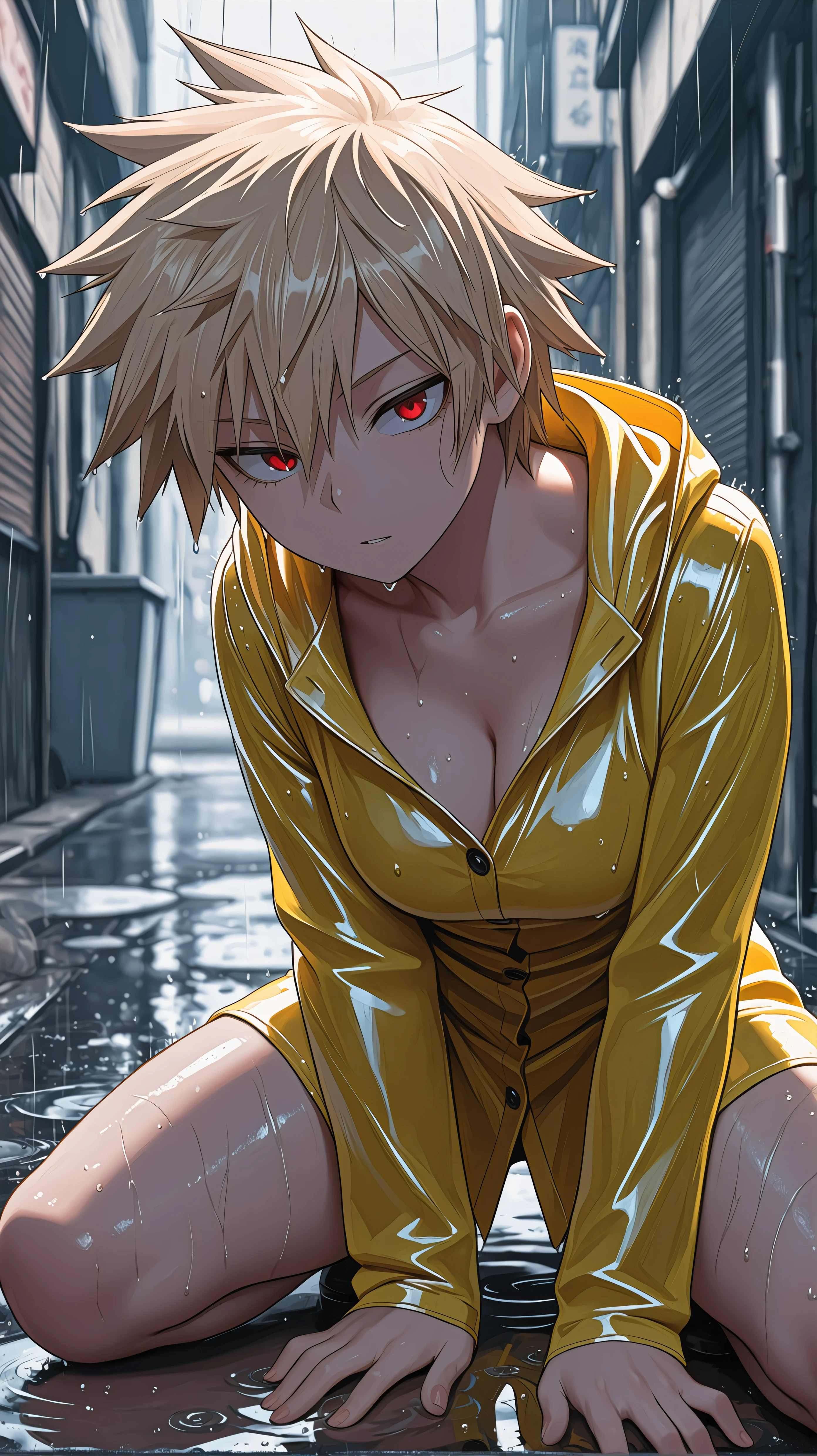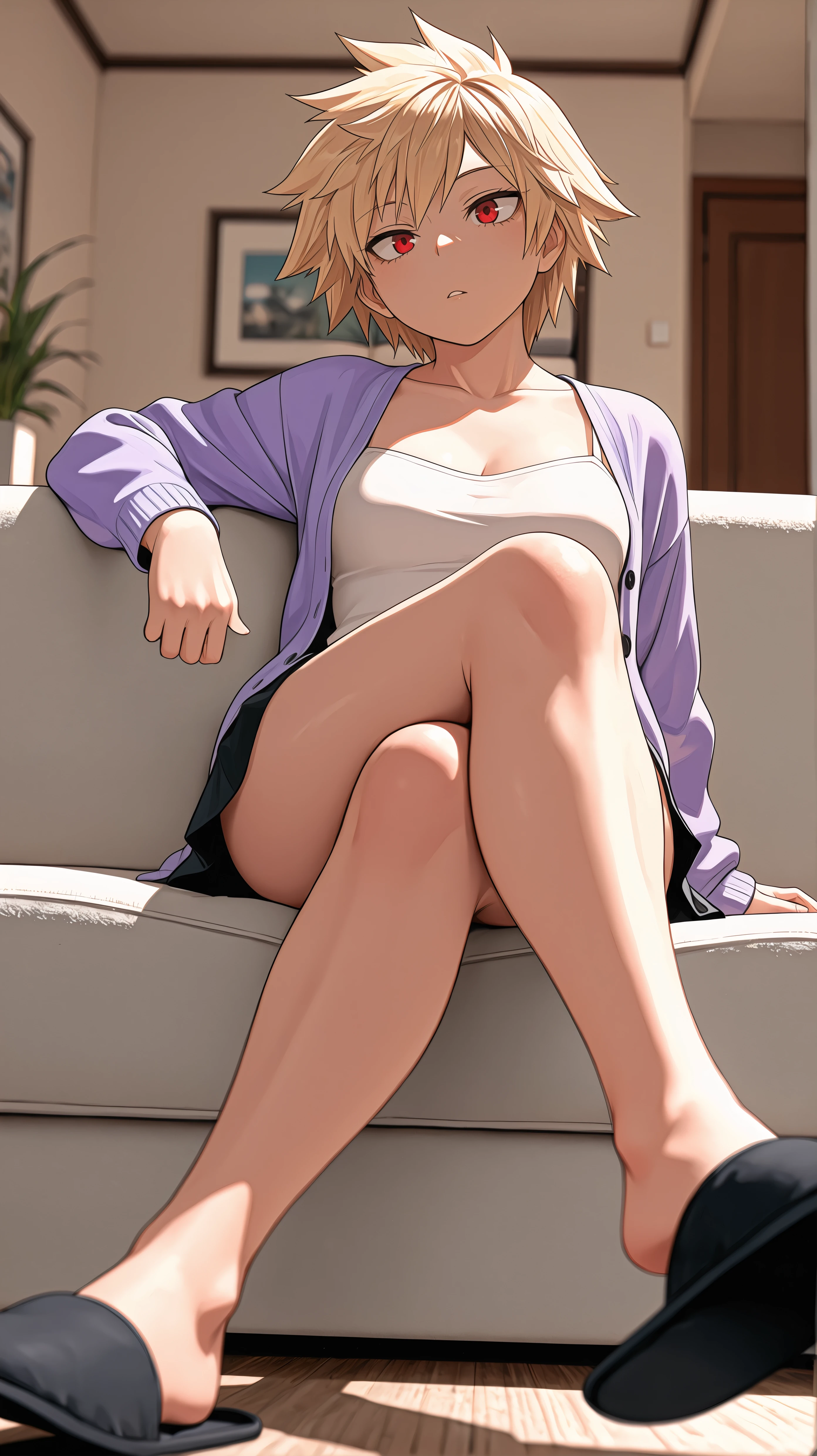 short hair, blonde hair, spiked hair, red eyes, purple cardigan, white camisole, black miniskirtDescription