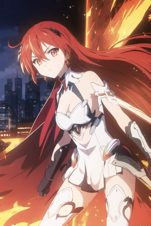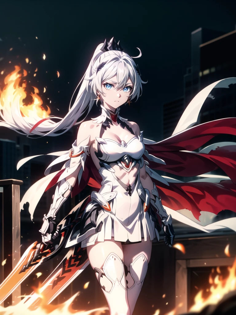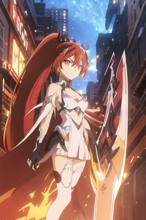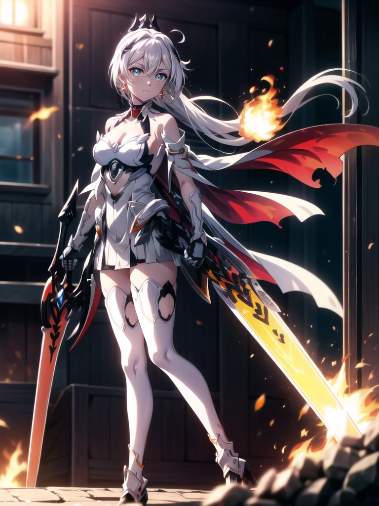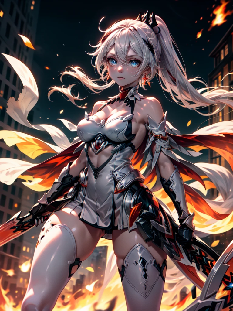 long hair,white hair,hair ornament,ponytail,blue eyes,hair between eyes,bare shoulders,gauntlets,1girl,armor,solo,cleavage,looking at viewer,gloves,jewelry,earrings,weapon,sword,thighhighs,cape,holding,holding weapon,holding sword,fire,boots,thigh boots,black gloves,torn cape,white footwear,antenna hair,City Background,flaming weapon,flaming sword,white thighhighs,dress,red hair,sky,outdoors