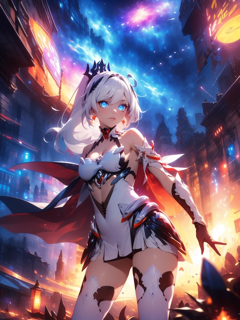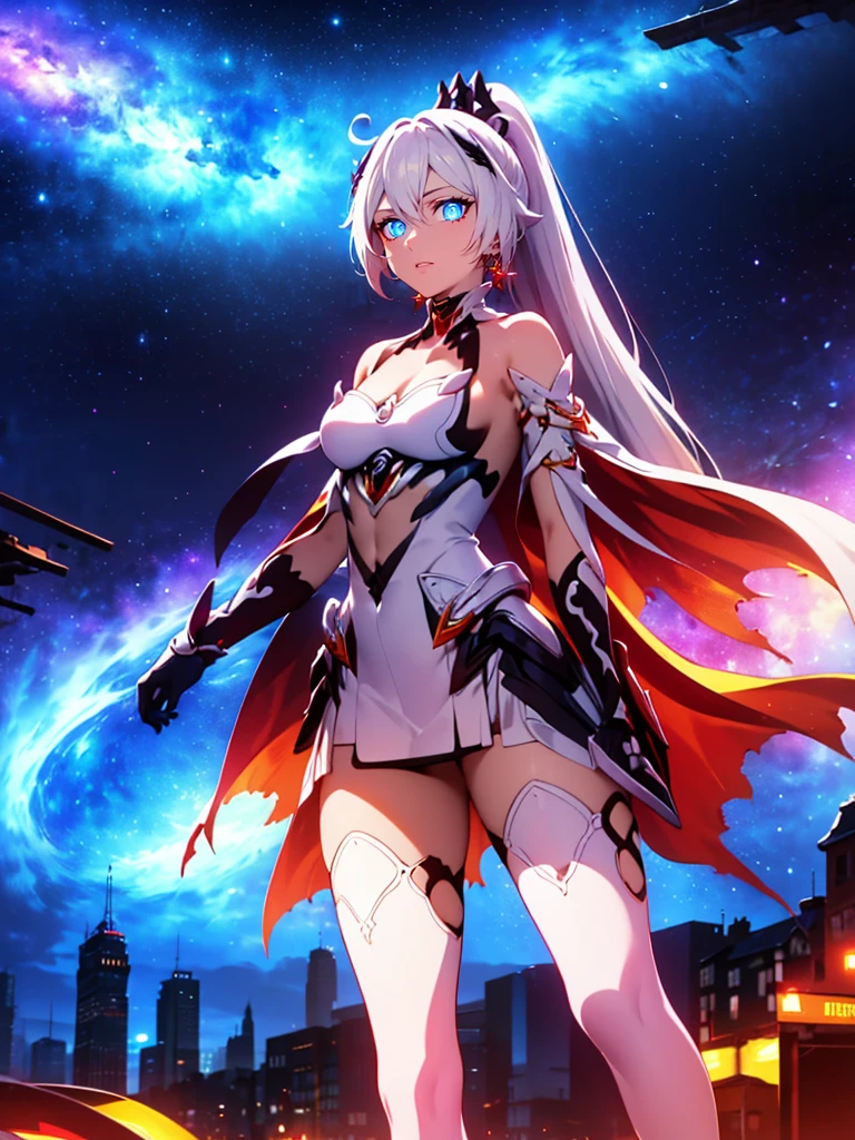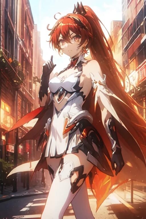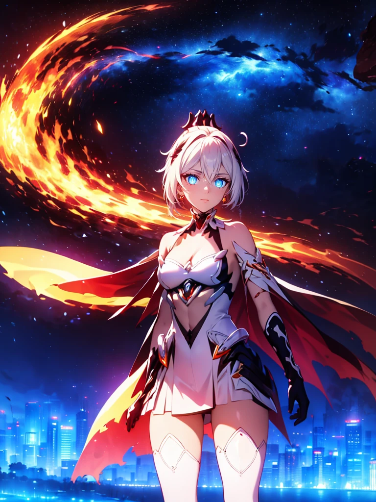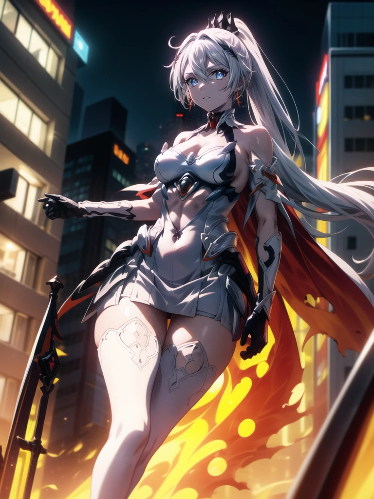 long hair,white hair,hair ornament,ponytail,blue eyes,hair between eyes,bare shoulders,gauntlets,1girl,armor,solo,cleavage,looking at viewer,gloves,jewelry,earrings,weapon,sword,thighhighs,cape,holding,holding weapon,holding sword,fire,boots,thigh boots,black gloves,torn cape,white footwear,antenna hair,City Background,flaming weapon,flaming sword,white thighhighs,dress,red hair,sky,outdoors