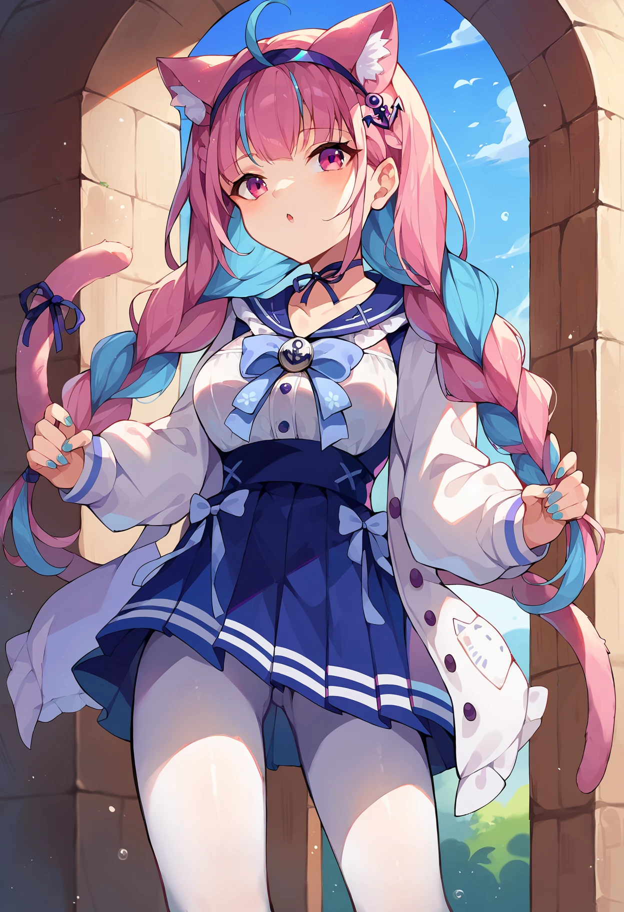 aquasai, long hair, twintails, braid, twin braids, ribbon choker, blue choker, blue hairband, anchor hair ornament, blue sailor collar, white shirt, long sleeves, high-waist skirt, blue skirt, pleated skirt, white jacket open jacket, blue bow, blue ribbon, anchor symbol, white pantyhose, blue nail polish, blue nails, cat girl, cat ears, cat tail, animal ear fluff, tail ribbon