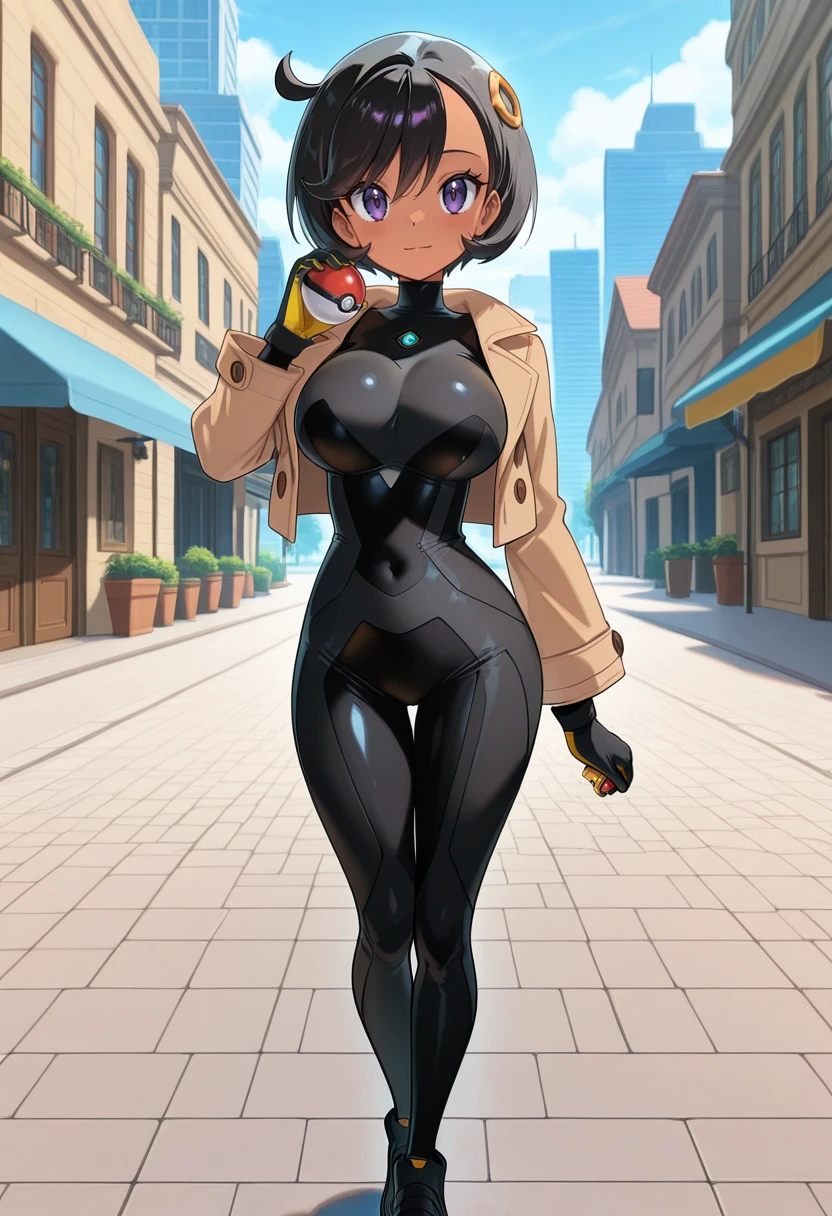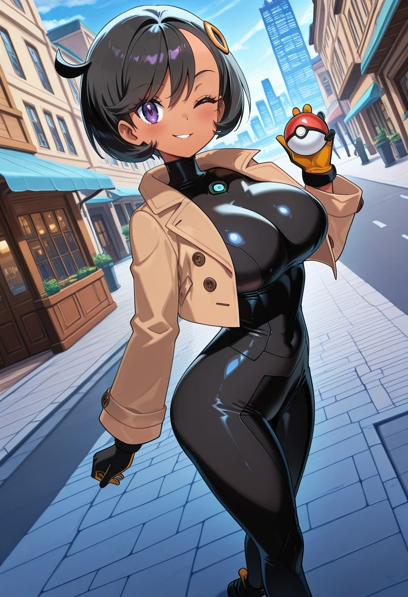 emmaZ-A (pokemon), 1girl, solo, black hair, short hair, hair ornament, purple eyes, dark-skinned female, large breast, curvy, wide hips,Normal Outfit: