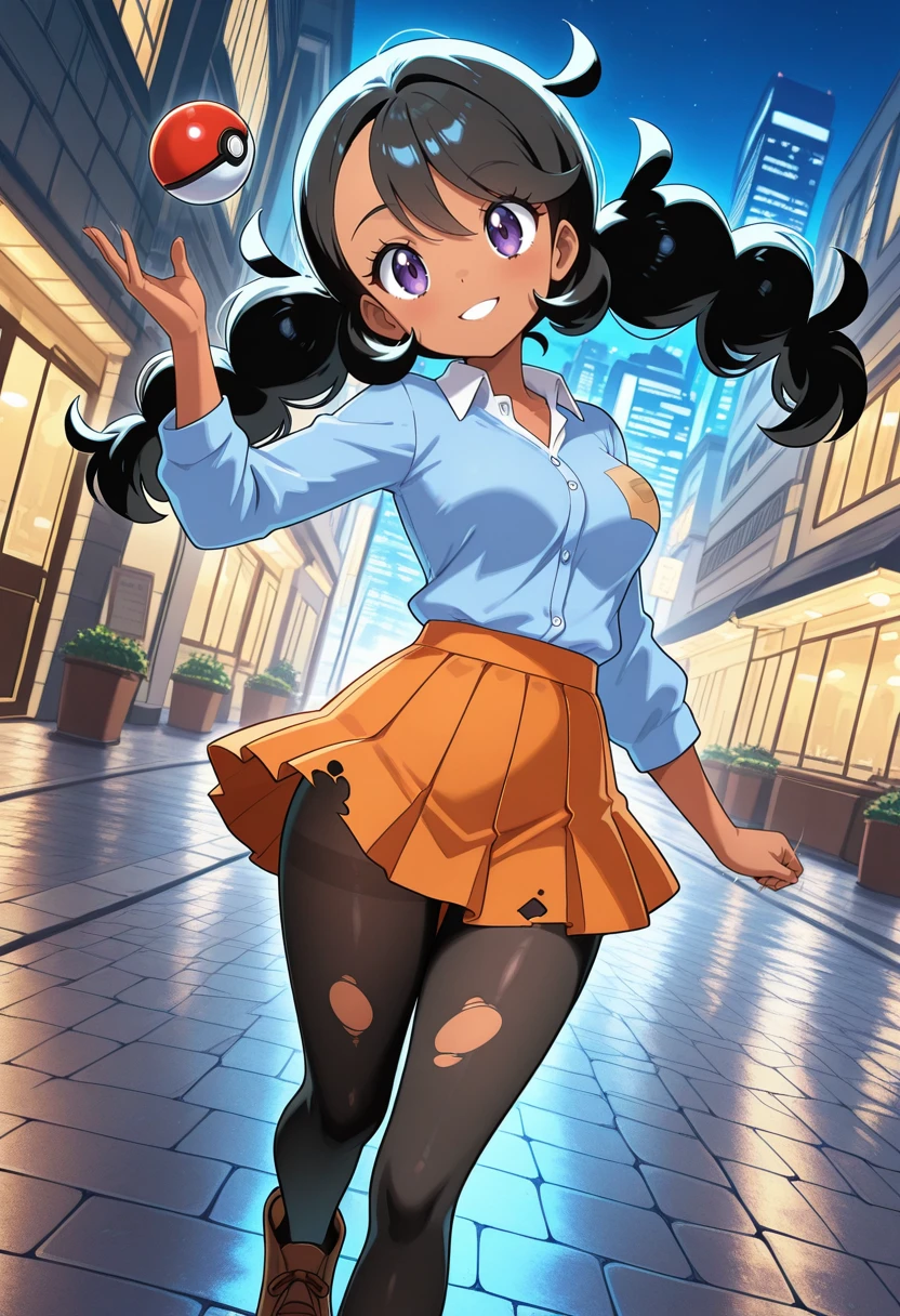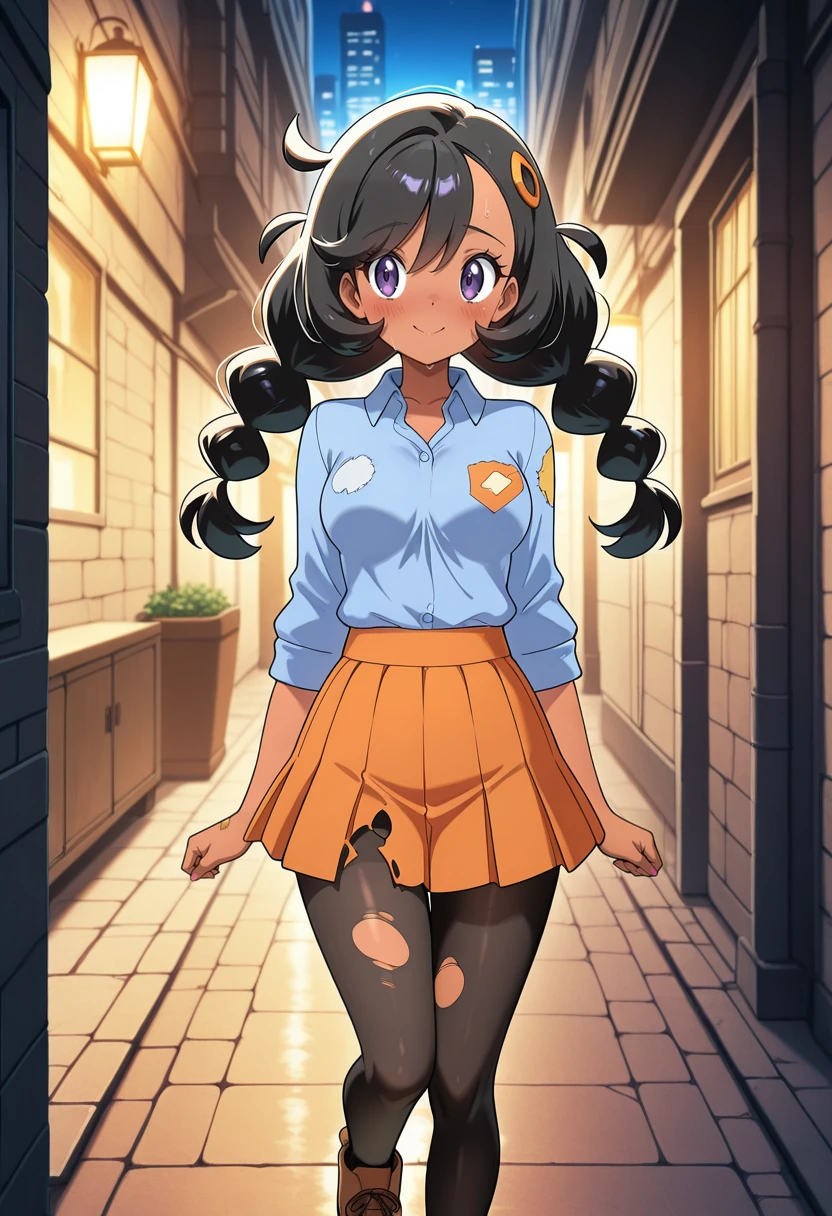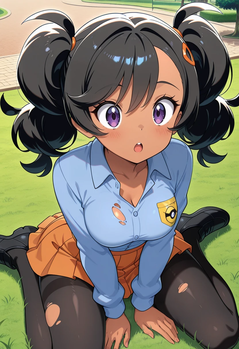 emmaX-Y (pokemon), 1girl, solo, black hair, long hair, twintails, purple eyes, dark-skinned female, medium breast, curvy, large hips, blue collared shirt, long sleeves, torn clothes, clothing patch, orange pleated skirt, miniskirt, black pantyhose, brown footwear, Emma X-Y Essentia