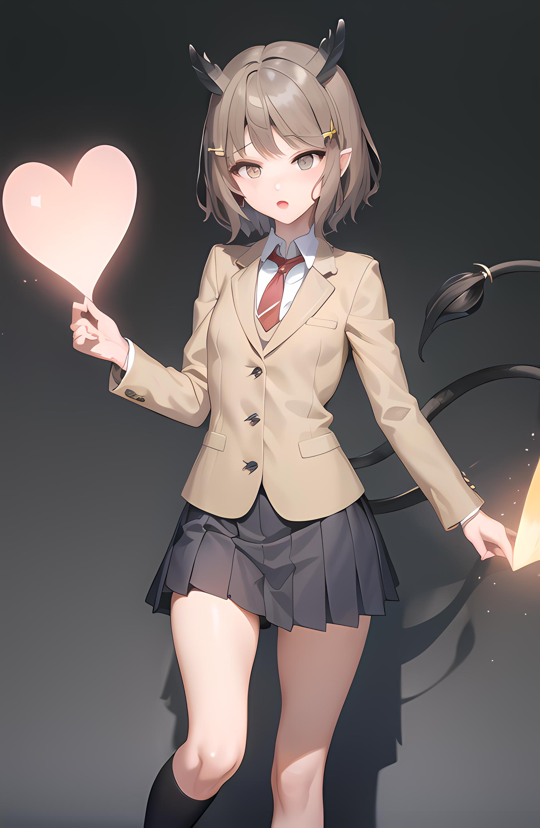 School uniform: Brown blazer, white shirt, red tie, blue skirt.
