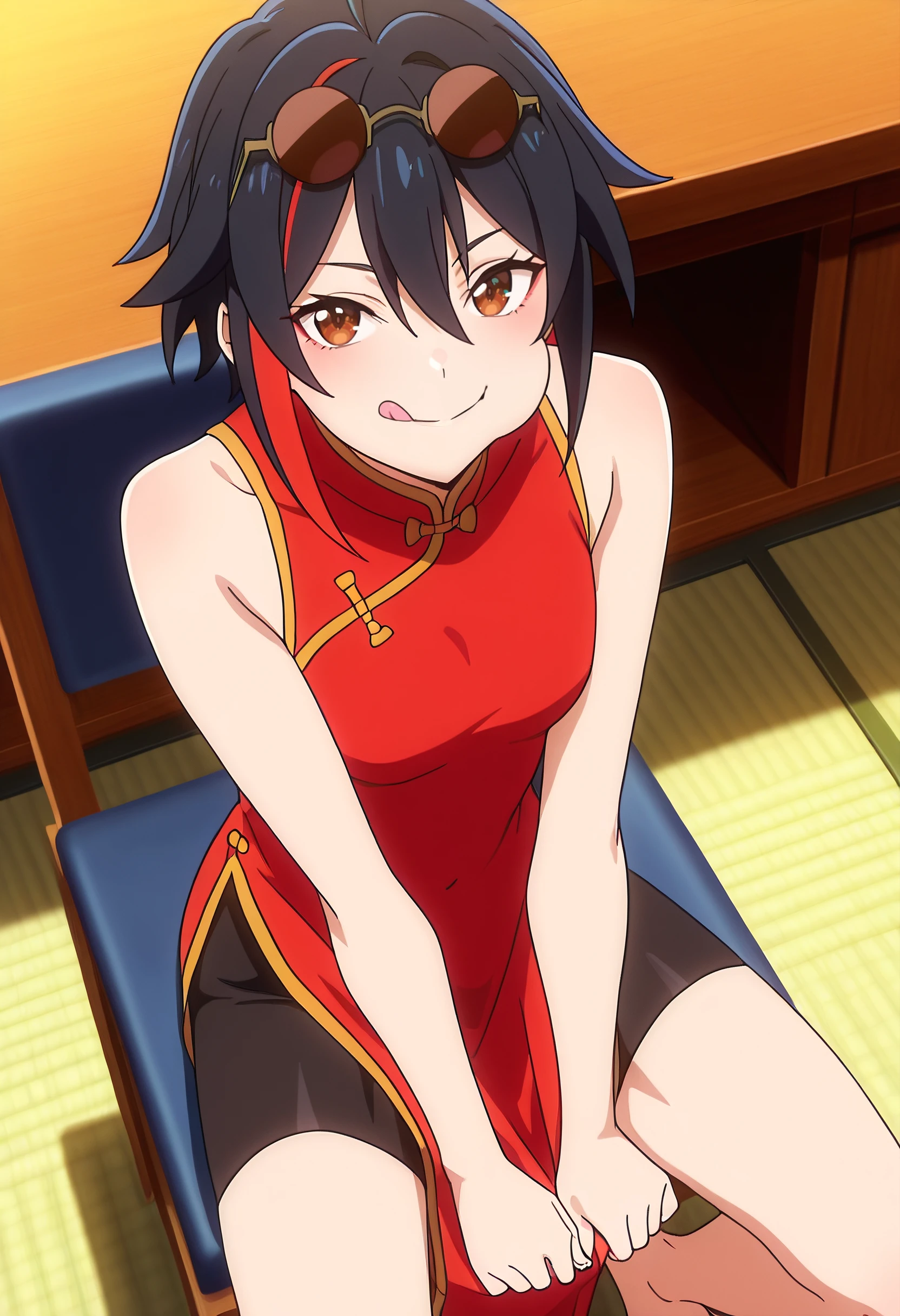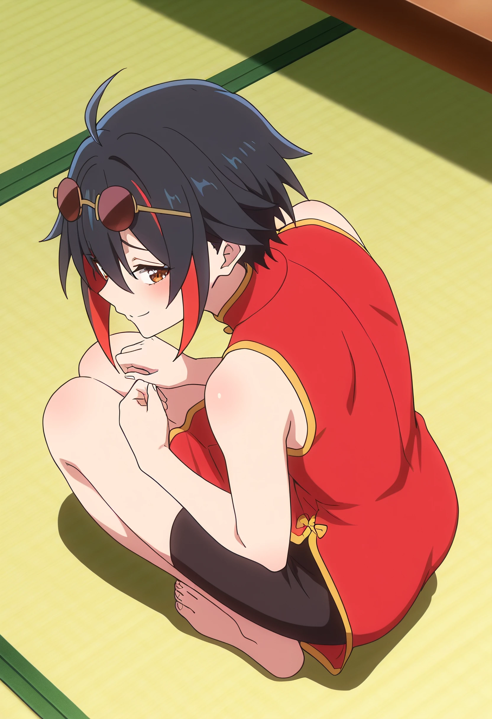 TakahashiDress, chinese clothes, sleeveless, dress, bare shoulders, eyewear on head, sunglasses, china dress, tatami, bare arms, barefoot, black shorts, shorts, sleeveless dress, red dress, bike shorts,
