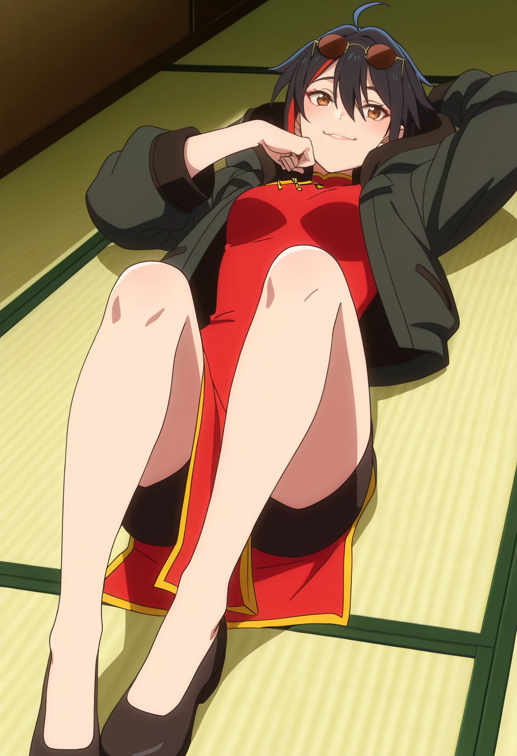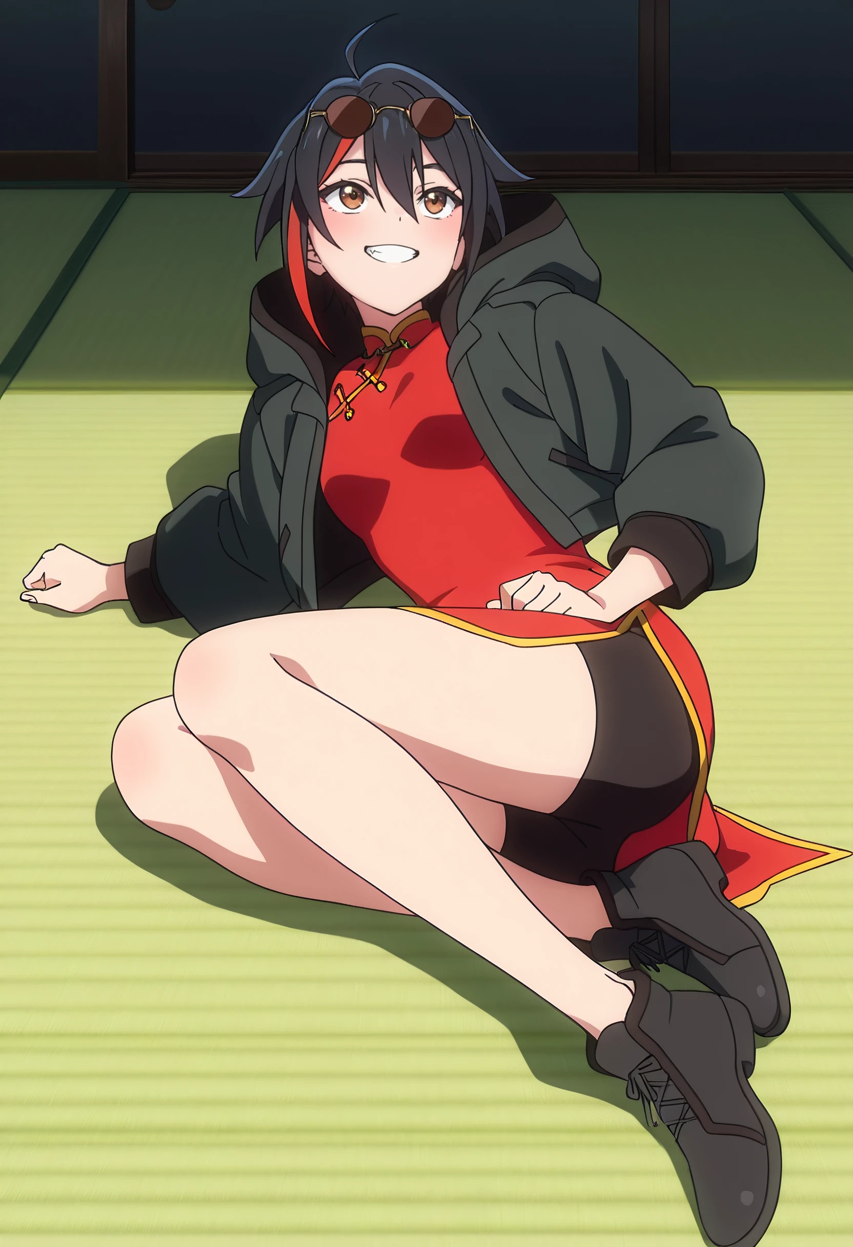TakahashiJacket, eyewear on head, hood, sunglasses, jacket, hood down, hooded jacket, china dress, long sleeves, tatami, dress, red dress, open clothes, shorts, black jacket, chinese clothes, black shorts, shorts under dress,